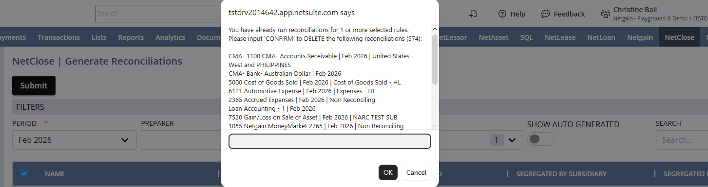 If you input "CONFIRM" and select OK, the old reconciliation record will be deleted and replaced with a new reconciliation, with a status of Not Started.