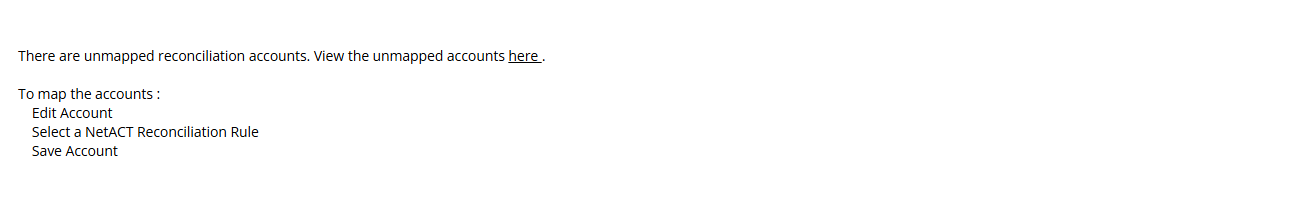 When accessing the Generate Reconciliations page, the system checks that all accounts in the Chart of Accounts are mapped to an Account Grouping. If any accounts are not mapped, you will receive the below error. Follow the instructions listed to map any unmapped accounts.
