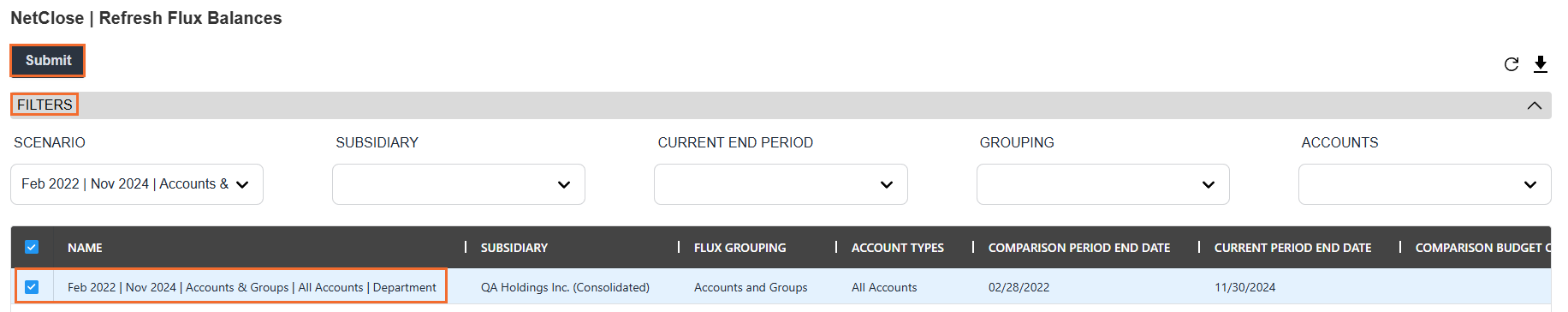 - On the Refresh Flux Balances page, use the available filters to locate the desired flux scenario.