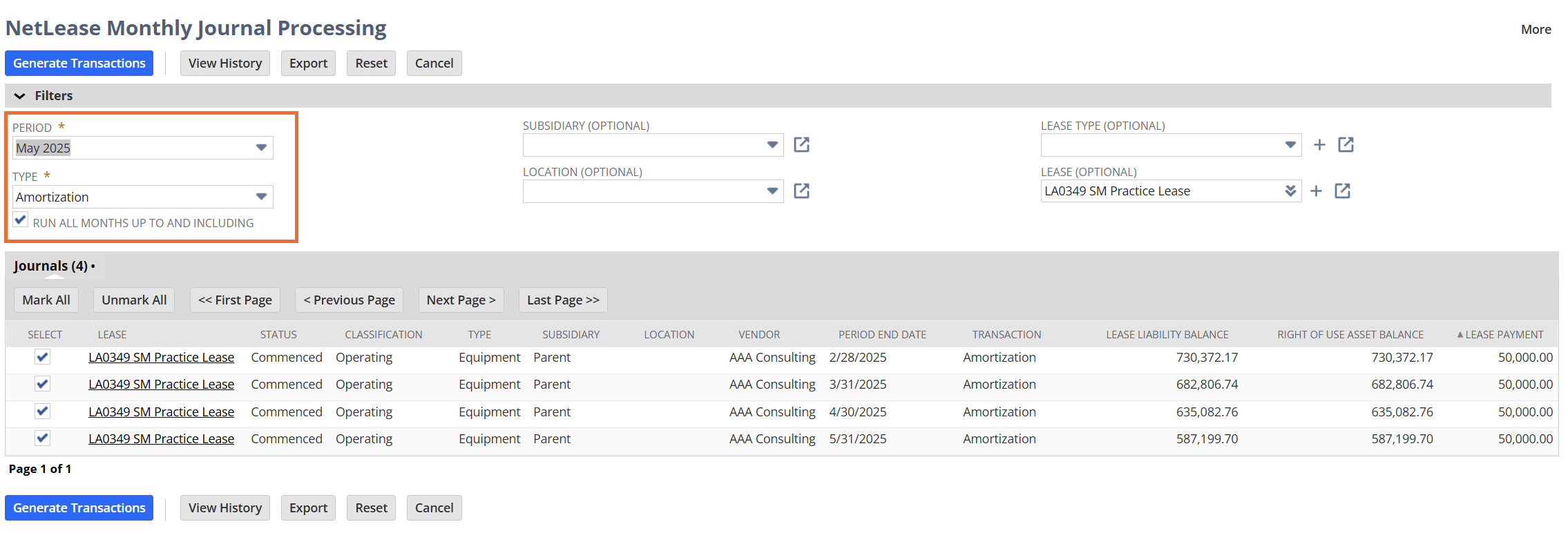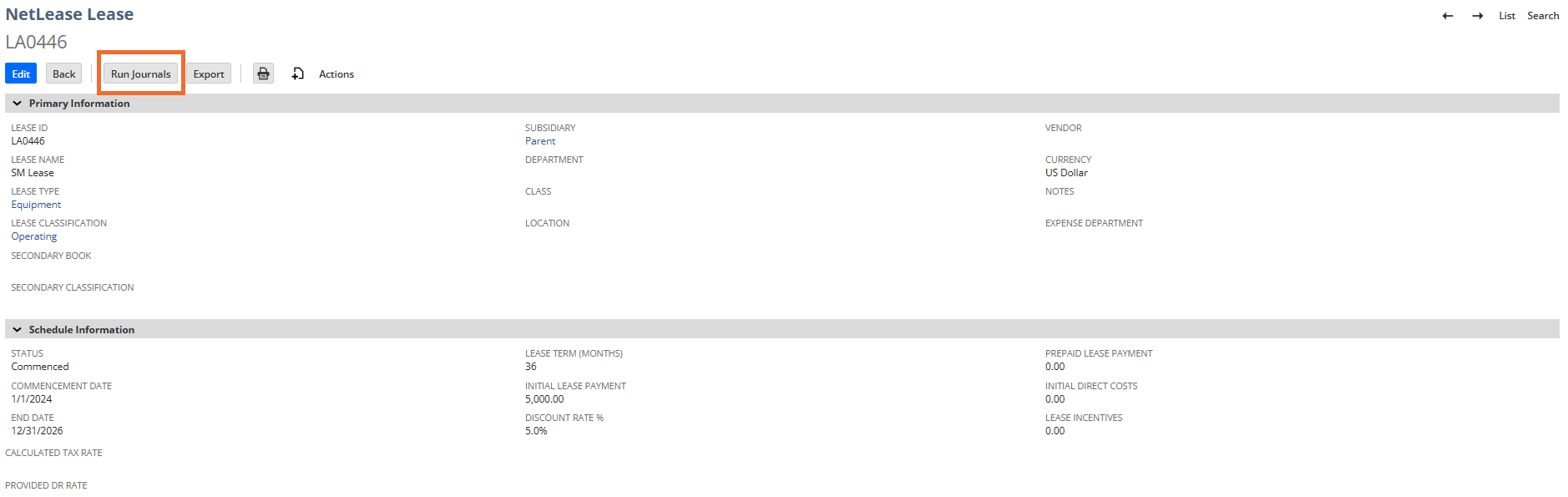 On the lease record, select Run Journals to run the NetLease Go Live Entry.