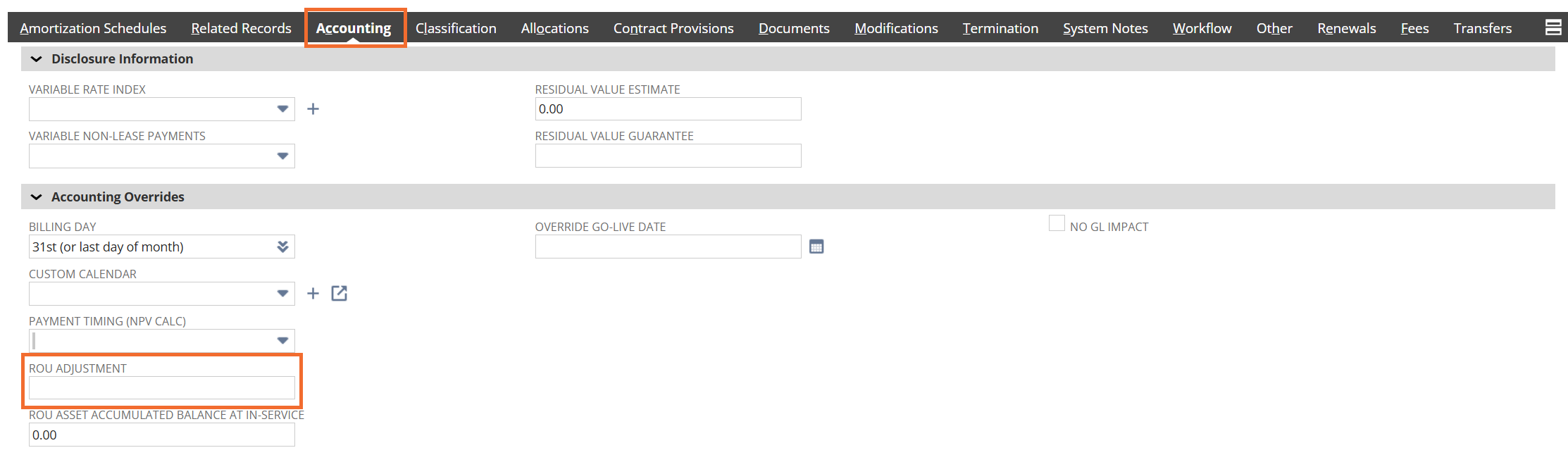 • If the net ROU asset is greater than the lease liability, enter the difference as a positive number in the ROU Adjustment field.