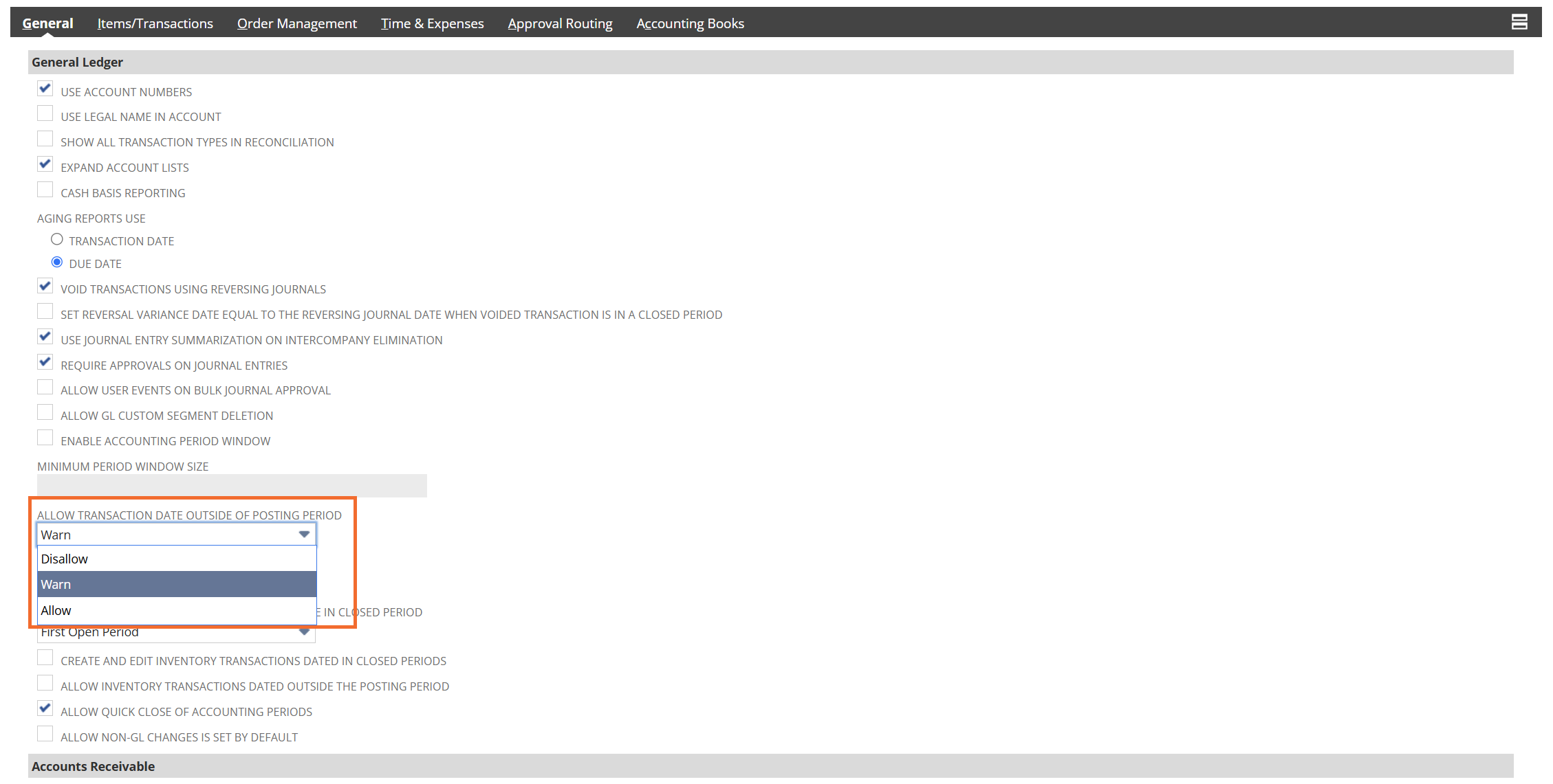 1. Ensure that your accounting preferences allow for transaction dates outside of the current posting period.