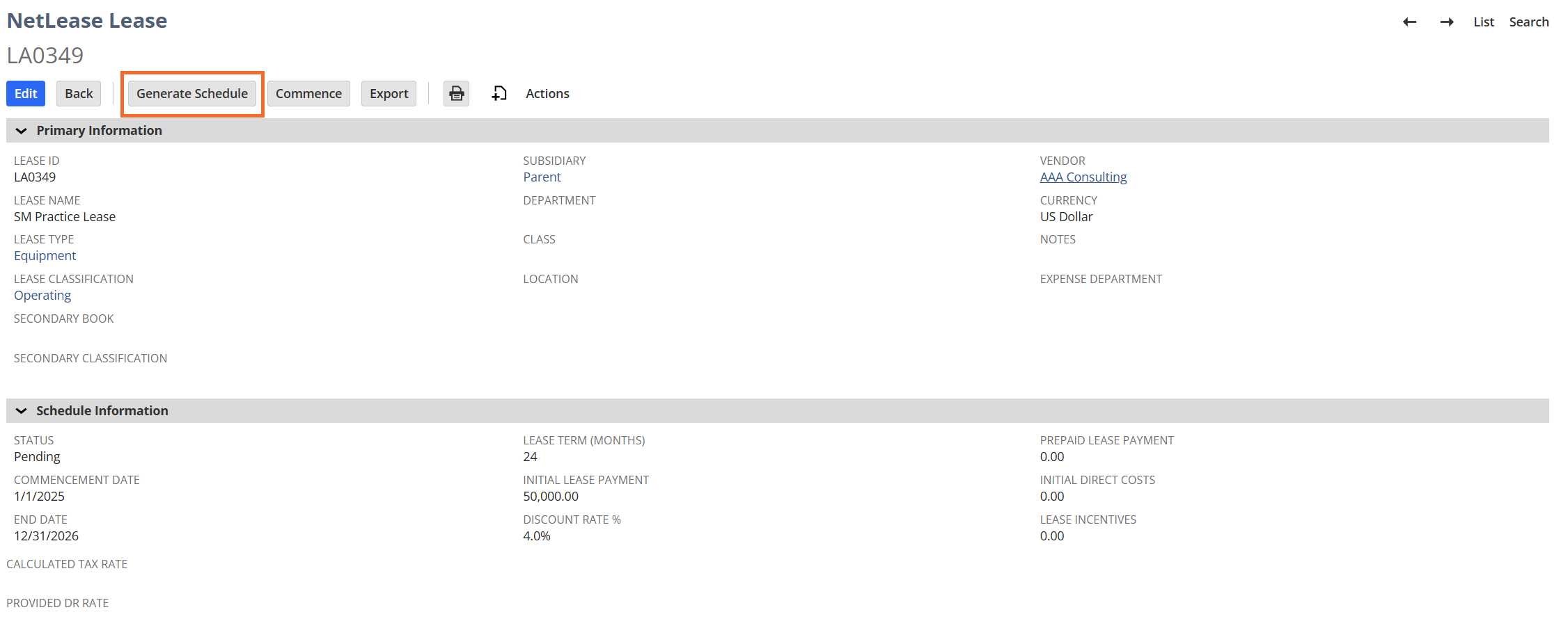 Once you save the lease record, generate the lease schedule. Once the schedule has been generated, take the time to validate the schedule to ensure the proper values are listed.