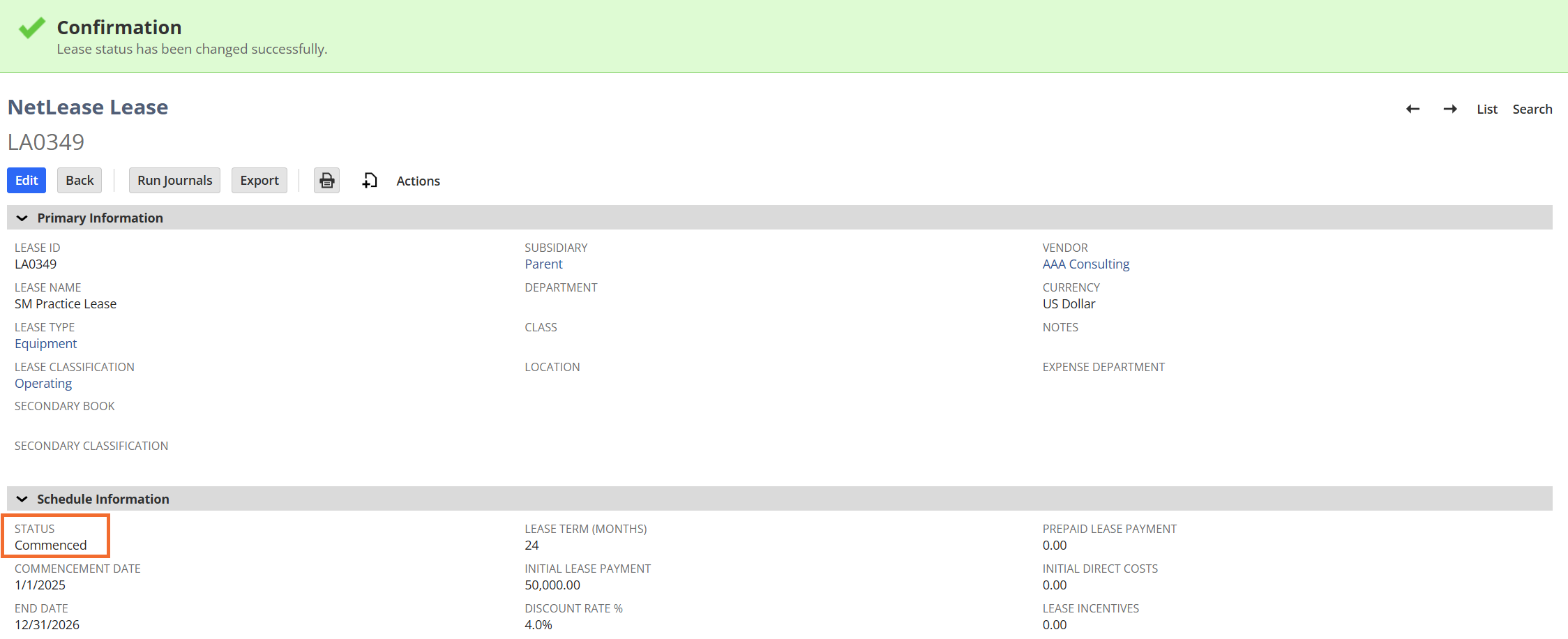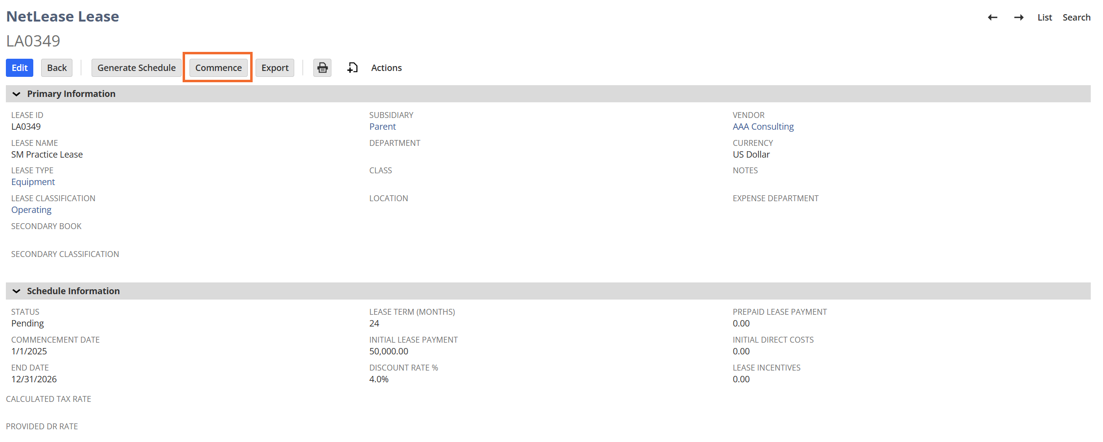 Once the lease schedule has been generated and validated, select Commence. The status of the lease should change from Pending to Commenced. This step is a status change, there is no journal entry associated with this step.