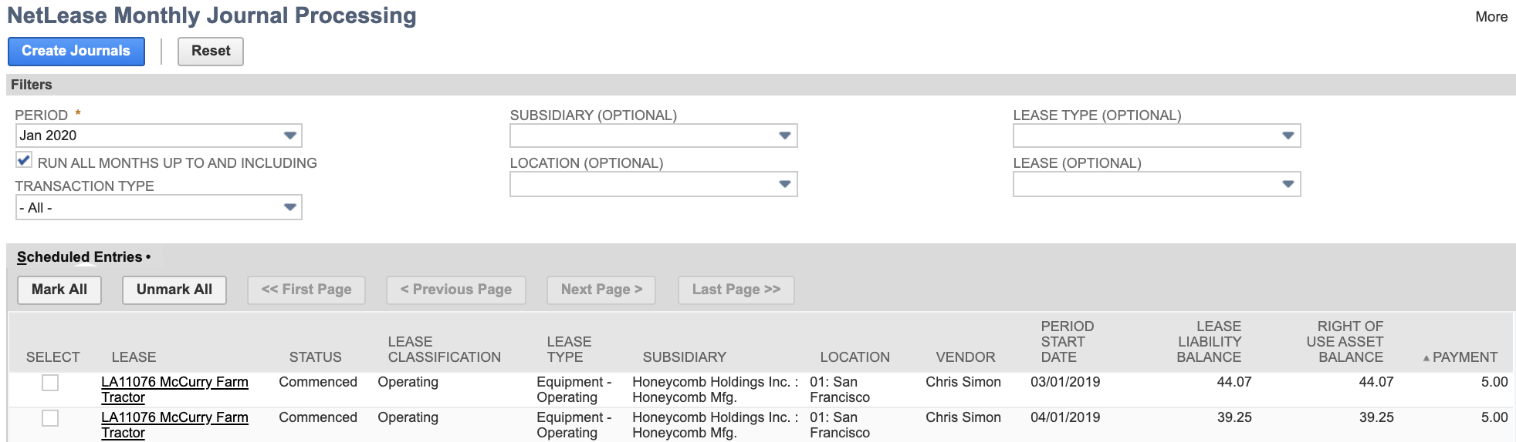 Navigate to the desired lease and select Run Journals. This will bring you to a journal processing screen where you can run your initial balance entry.