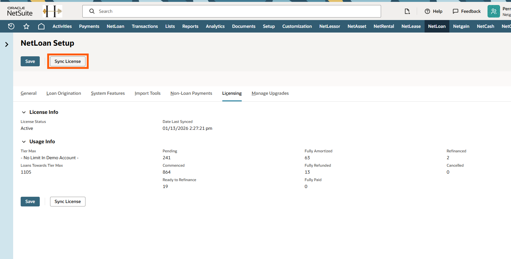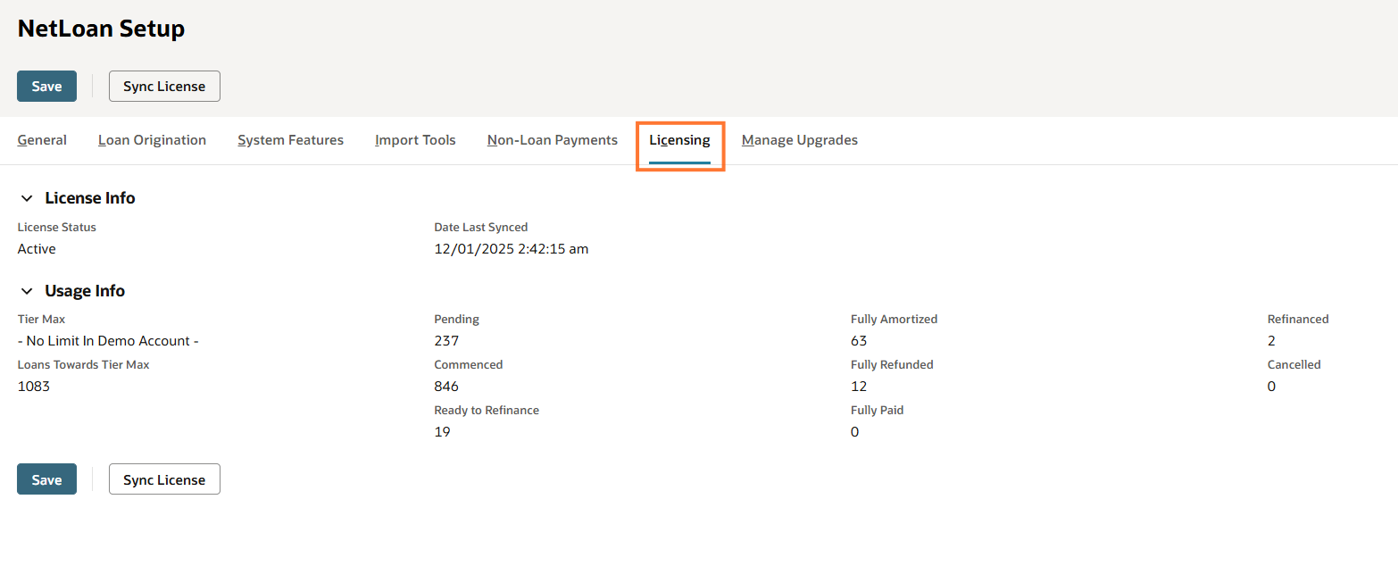 The NetLoan Usage Statistics feature displays the number of loans currently in an account compared to the maximum number allowed under the license. This information is available within NetLoan  > NetLoan  Setup > System Setup on the Licensing tab and provides visibility into license limits to help determine when additional loan capacity is needed.