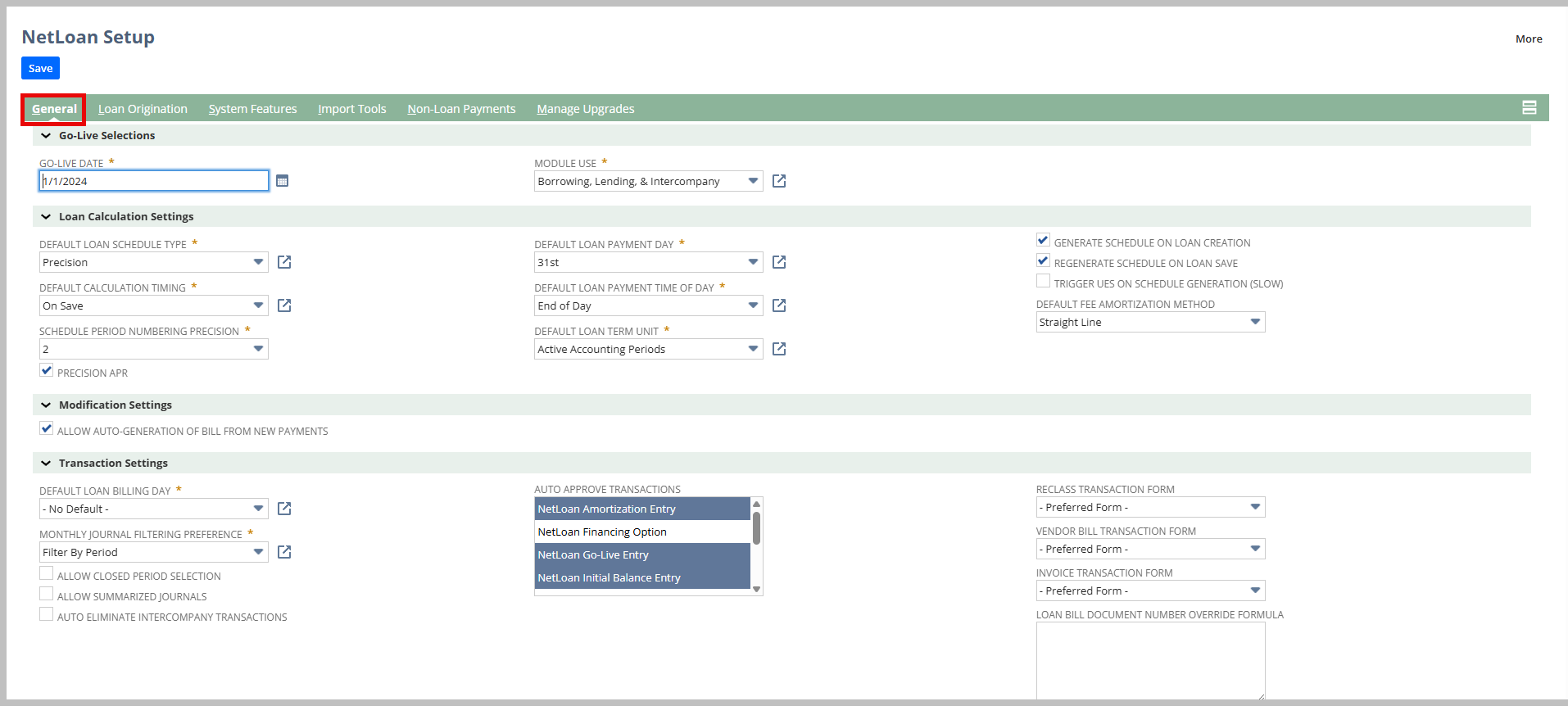 | Auto Approve Transactions | Yes | Indicate the loan transactions to be automatically approved upon generation by the NetLoan module. Our recommendation is to approve all as the entries that are system-generated. Many journal entries are created on a loan-by-loan basis, which may require a more extensive approval process. Hold down the Ctrl button to select multiple entries. | NetLoan Amortization Entry |