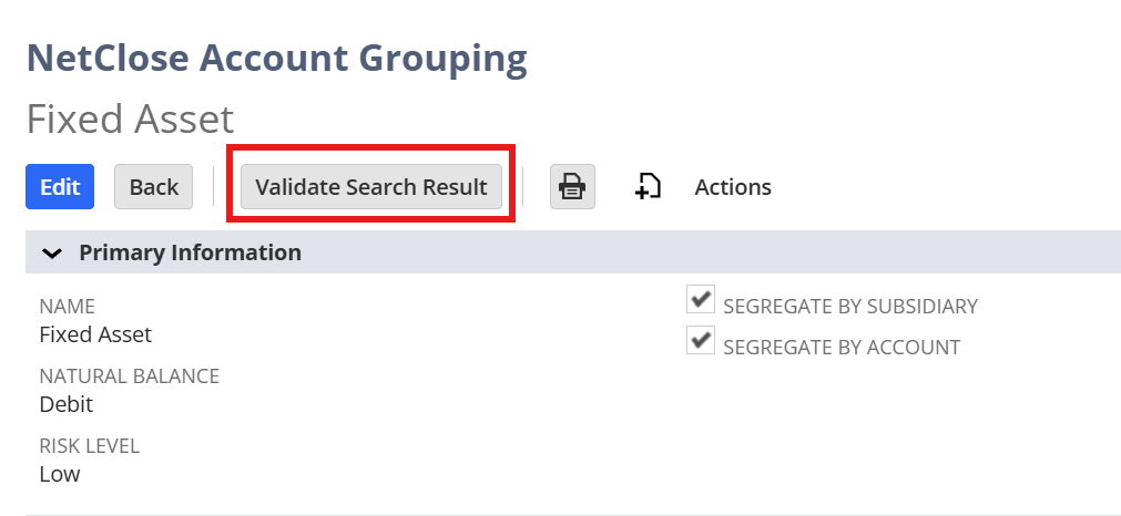 1. On the account grouping, click the "Validate Search Result" button. If the internal IDs are correctly entered and the save search is set up correctly, the system will give you a value.