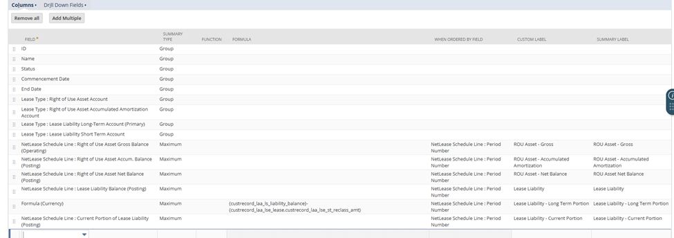 | Formula (Currency) | Maximum | {custrecord_laa_ls_liability_balance}-{custrecord_laa_lse_lease.custrecord_laa_lse_st_reclass_amt} | NetLease Schedule Line: Period Number | Lease Liability - Long Term Portion |