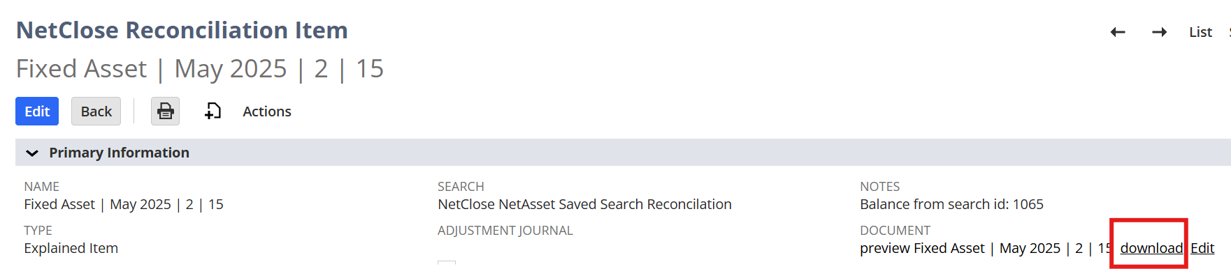 3. After the groupings have finished generating, go to prepare the reconciliations by going to NetClose > Reconciliations > Prepare Reconciliations and filter for the groupings you generated. You should see the "Explained Balance" is auto-filled by the saved search results. Click on a reconciliation to see the item. Then click the item to download the excel of the saved search.