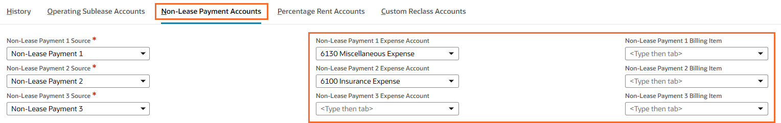 Expense accounts and billing items for non-lease payments must be assigned at the lease type level.