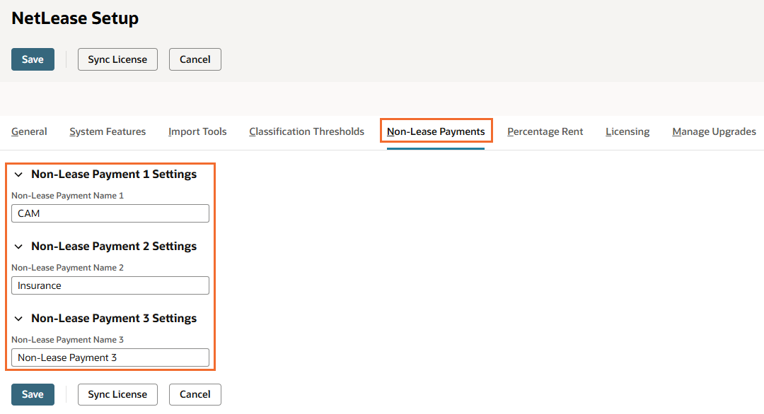 - Enter the desired names for each non-lease payment field (e.g., CAM, Insurance). These labels will be used to identify each payment type.