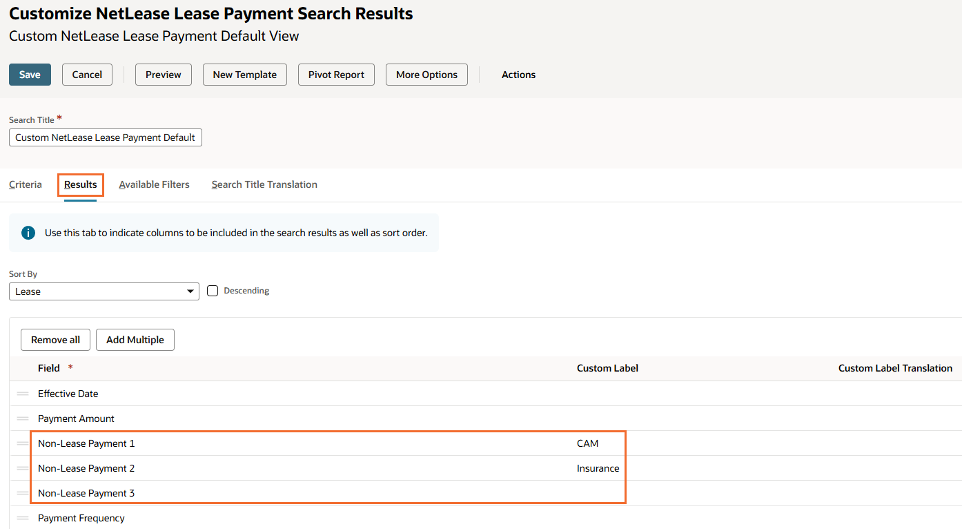 - On the custom search view, under the Results subtab, update the column labels for each non-lease payment field to match the desired names.