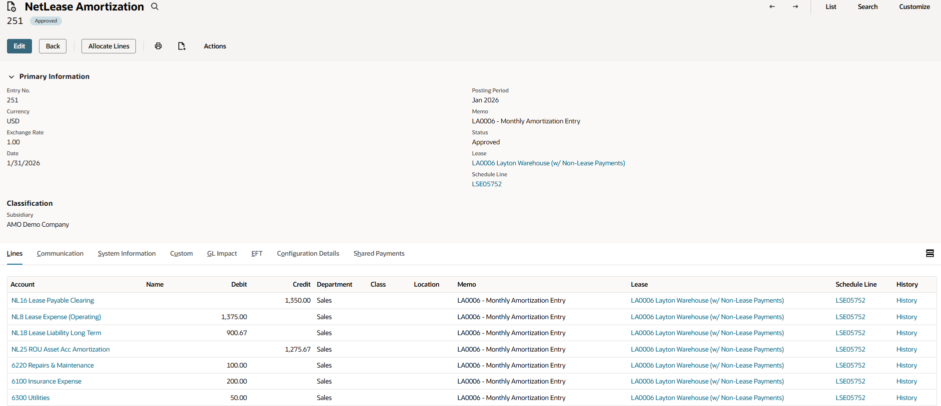 - When amortization journal entries are run for a lease that includes non-lease payments, the resulting journal entry will include additional lines for each configured non-lease payment.
