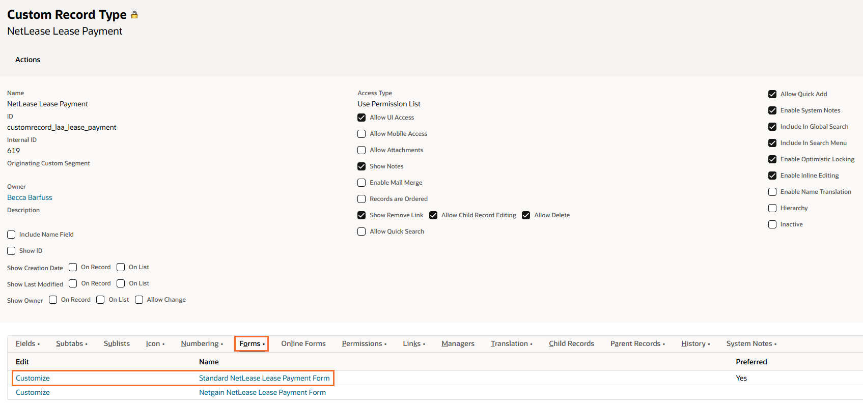 - On the Forms subtab, select Customize to the left of the Standard NetLease Lease Payment Form.