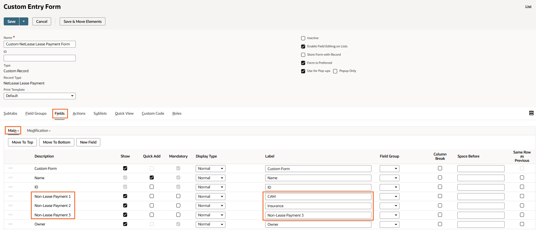 When creating a new NetLease Lease Payment, the field labels on the record form default to the standard Non-Lease Payment 1, Non-Lease Payment 2, and Non-Lease Payment 3 labels rather than the custom names configured above. To align the form labels with the configured naming convention, the field labels must be updated on the NetLease Lease Payment record form.