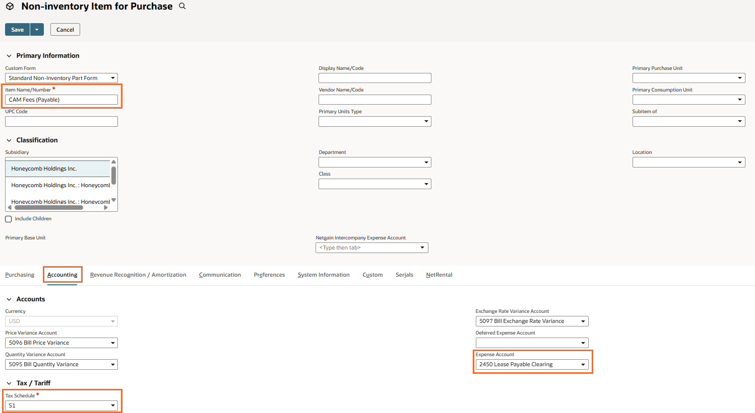 - Under the Accounting subtab, enter the lease payable clearing account as the Expense Account and assign the appropriate Tax Schedule.