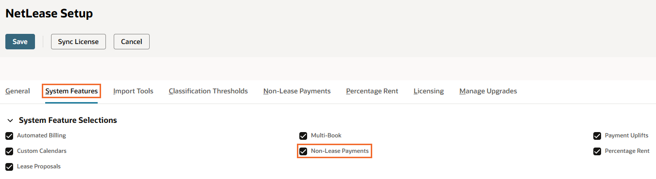 The Non-Lease Payments feature must be enabled before beginning configuration. Navigate to NetLease > NetLease Setup > System Setup and select the System Features subtab. Check the Non-Lease Payments checkbox.