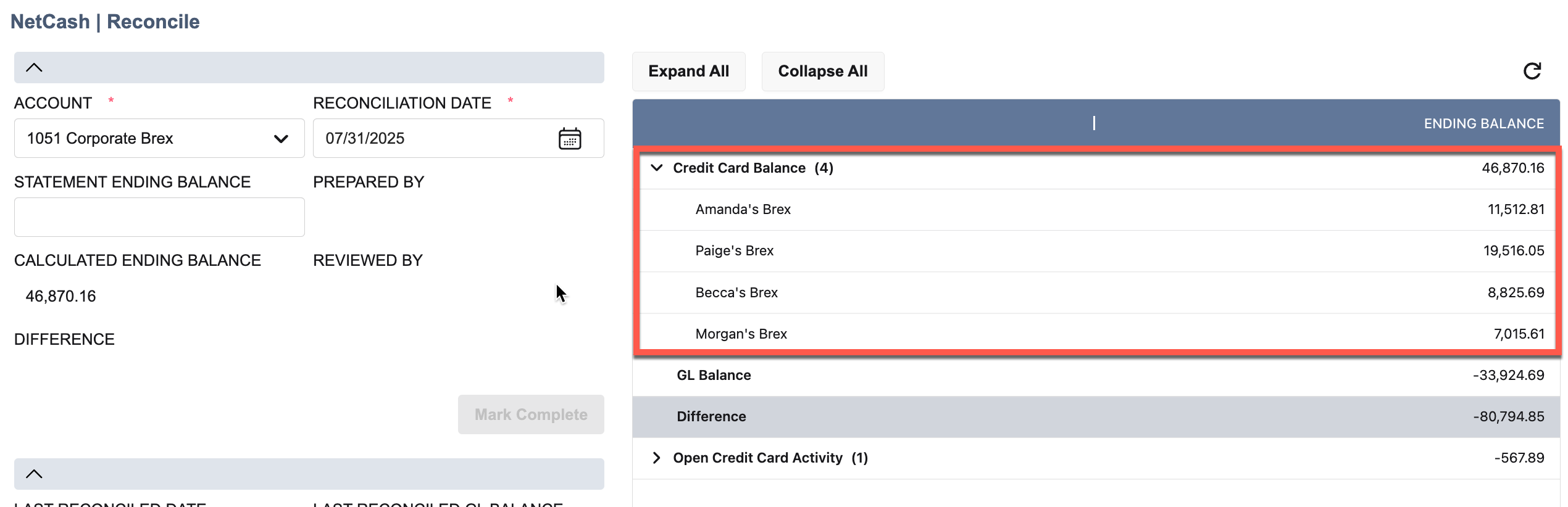Similar to Bank Account reconciliations, users can reconcile their Credit Card Accounts any day of the month. The general process for reconciling in NetCash can be found in this article. There are certain differences for Credit Card reconciliations. In NetSuite a Bank Account can only be associated with one GL Account and that is the same for NetCash. On the other hand, multiple Credit Card Accounts can be linked to a single Credit Card GL Account. To accomodate for this, on the NetCash Reconcile Page, when a Credit Card GL Account is selected NetCash will display the total balance for all NetCash Credit Card Accounts associated with that single Credit Card GL Account. This allows companies to reconcile a single Credit Card to one GL Account or multiple Credit Cards to one GL Account.