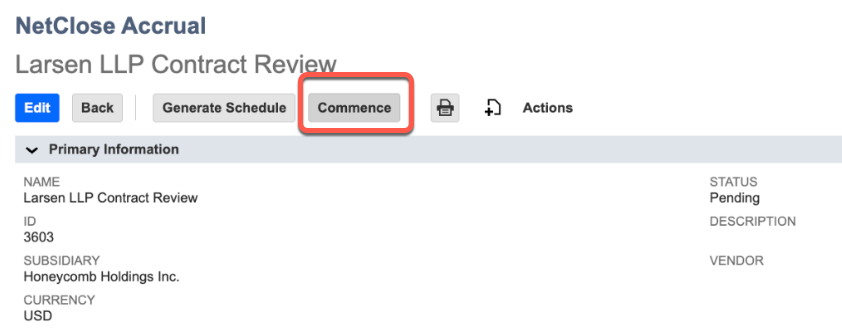 After a schedule has been generated, the user can commence the Accrual by clicking the Commence button on the Accrual or on the Commence Accruals Page.
