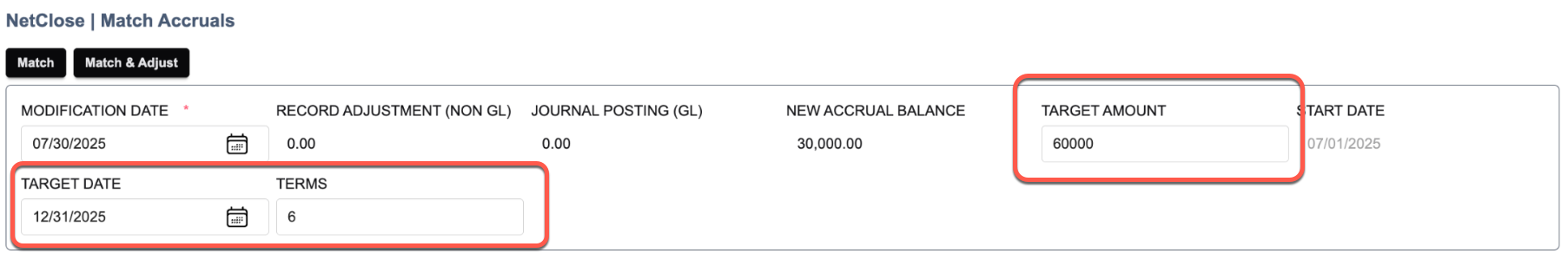 Similar to standard Accruals, users can match incoming Bills to Accreting Accruals and modify or adjust Accreting Accruals mid-life. When matching and/or adjusting an Accreting Accrual, there are additional fields on the Match and Adjust pages that users must be aware of. When an accrual is matched to a bill or adjusted, NetClose will not automatically update the Accreting Accrual's Target Amount, Target Date, or Terms. If the estimated accrual Target Amount or Date has changed as a result of the matched bill or adjustment, then the user should change the Target Amount, Date, or Terms on the Match or Adjust page before submitting the action. NetClose will update the Accreting Accrual schedule based on the New Accrual Balance, Target Amount, and Target Date shown on the Match and/or Adjust Page.