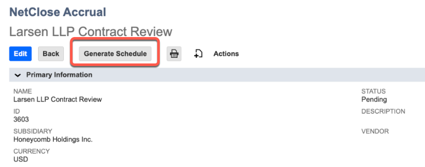 Once an Accreting Accrual has been created the Accrual Schedule will need to be generated. A schedule can be generated by clicking Generate on the Accrual record or from the Accruals Generate Schedules Page.