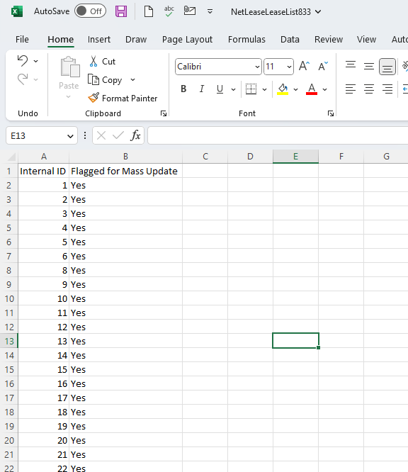 - Once you have the internal ID's listed for the records you wish to flag for mass update, create another column labeled Flagged for Mass Update, and mark each row as Yes.