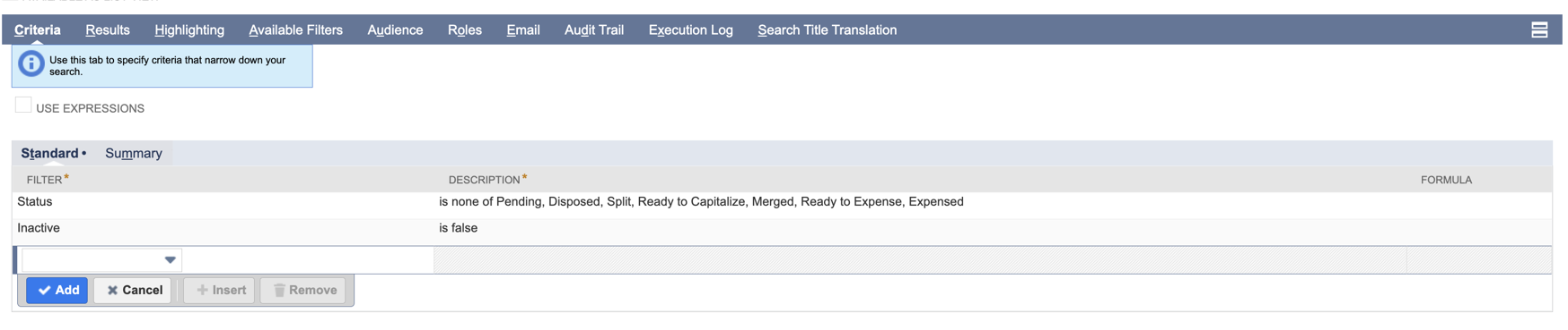 | Status | is none of Pending, Disposed, Split, Ready to Capitalize, Ready to Expense, Expensed |
