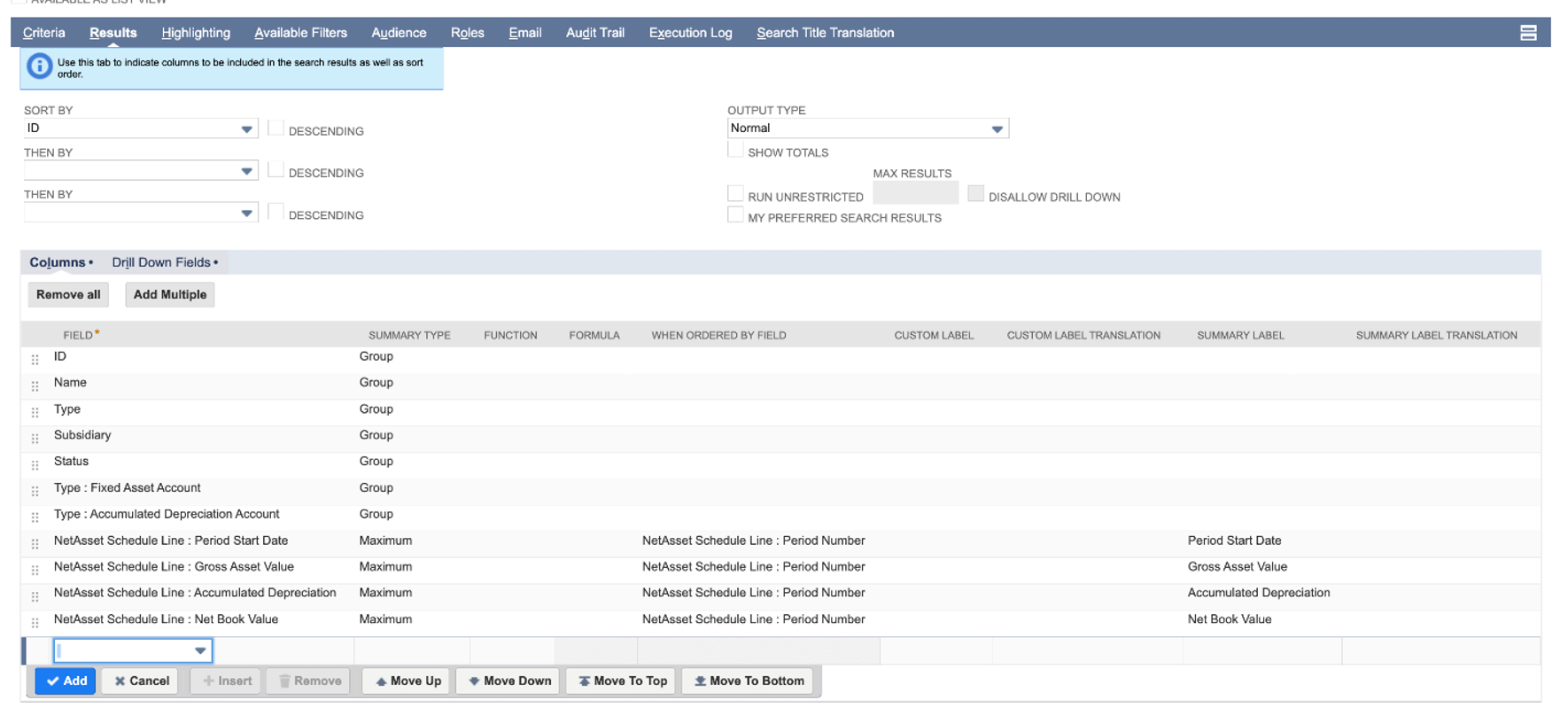 8. The Search Column Label will depend on if your grouping includes fixed asset and depreciation accounts or if they are in separate groupings. For example, if the grouping includes all asset accounts, the label will be "Gross Asset Value". If the groupings are separate, the label will either be "Net Book Value" or "Accumulated Depreciation".