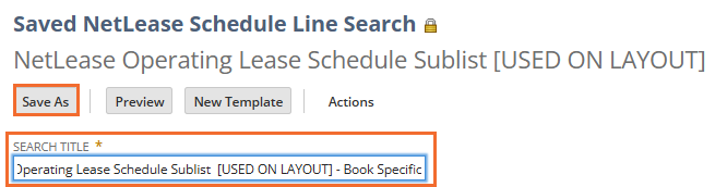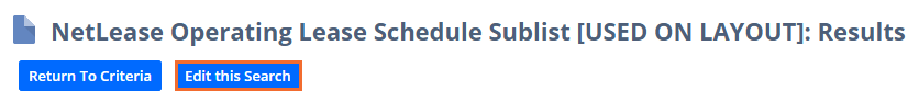 • Copy the name of the Saved Search identified in Step 1 (e.g., NetLease Operating Lease Schedule Sublist [USED ON LAYOUT]), paste it into the global search, and then open the saved search from the results.