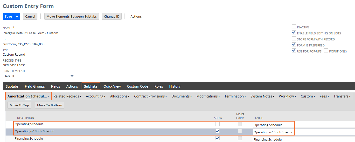 • Under the Sublists subtab and the Amortization Schedules sublist, ensure the out-of-the-box amortization schedule sublist is set to not show and the newly created amortization schedule sublist is set to Show. Then rearrange the order of the sublists as needed.
