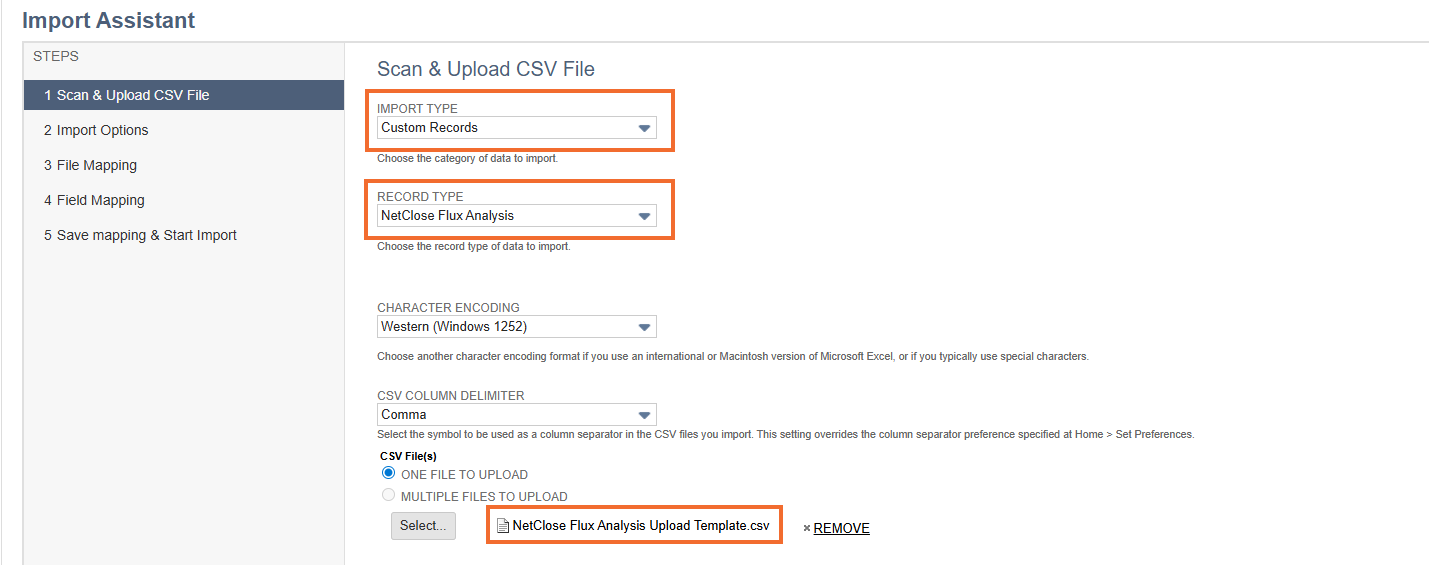 - With the Import Assistant open, update the Import Type to Custom Records and the Record Type drop-down to NetClose Flux Scenario.