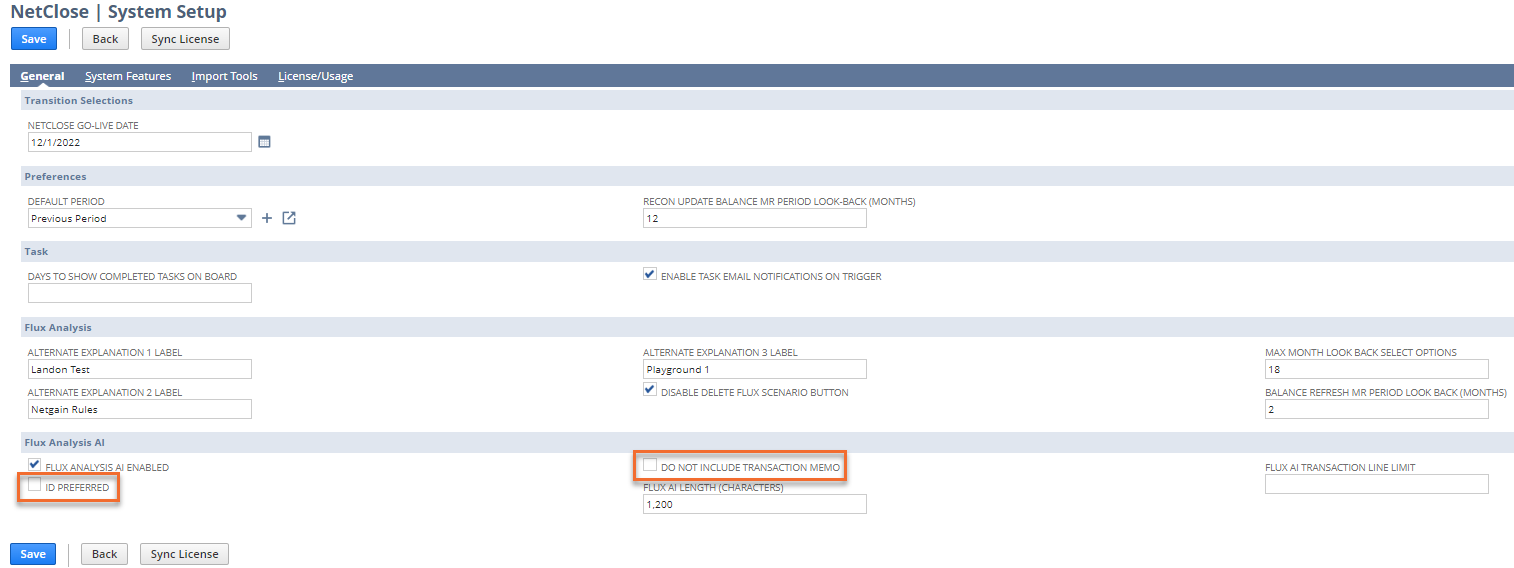 Flux AI settings are managed under NetClose > Setup > System Setup, under the Flux Analysis AI field group.