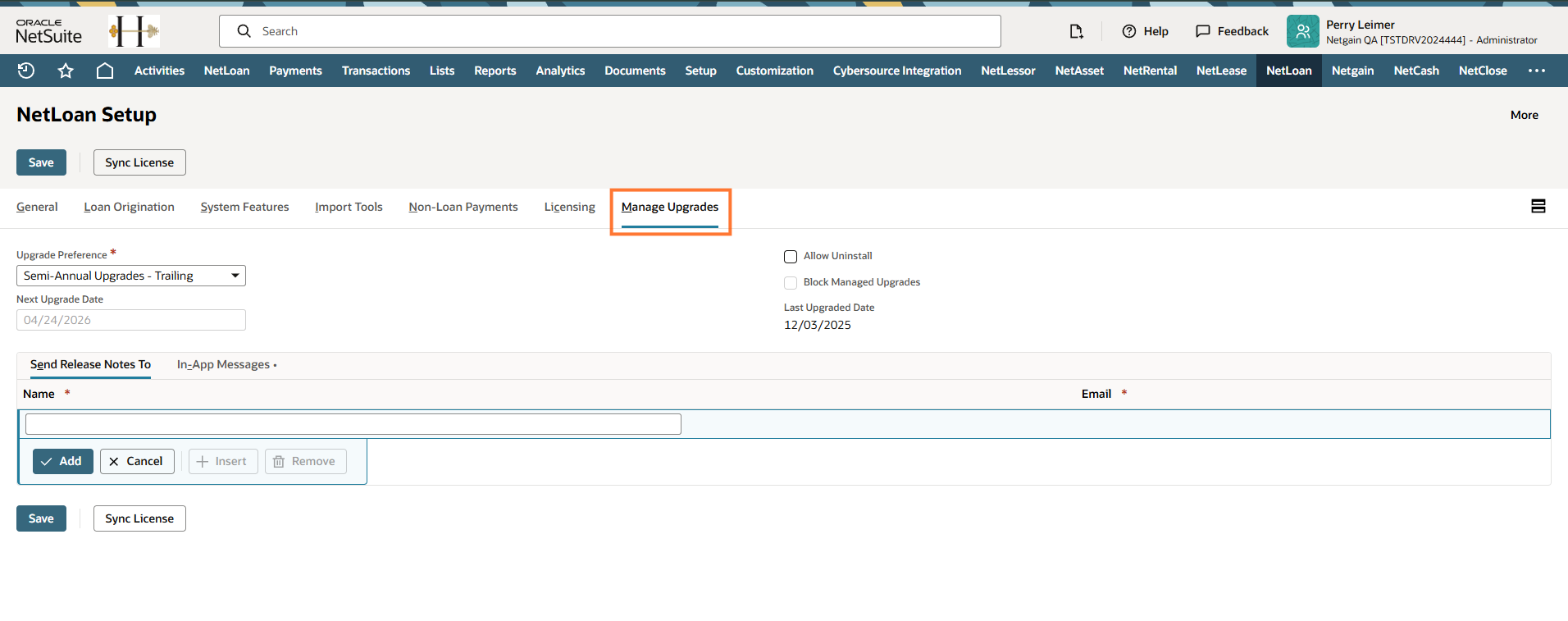 This is a subtab where information is entered for those individuals in your organization who would like to receive release notes when NetLoan Upgrades become available.