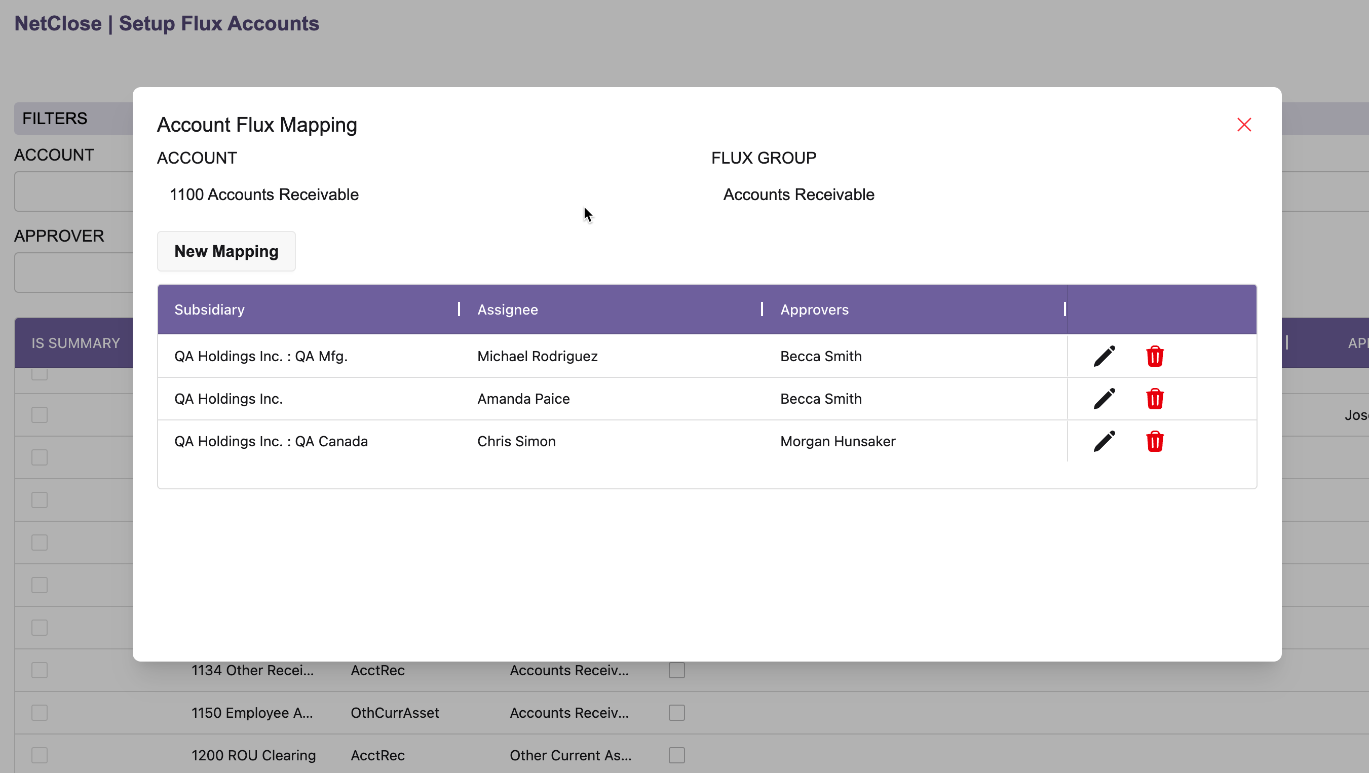 The Account and Subsidiary level Assignees and Approvers can be configured using a CSV import of the NetClose Flux Account Mapping Custom Record Type.