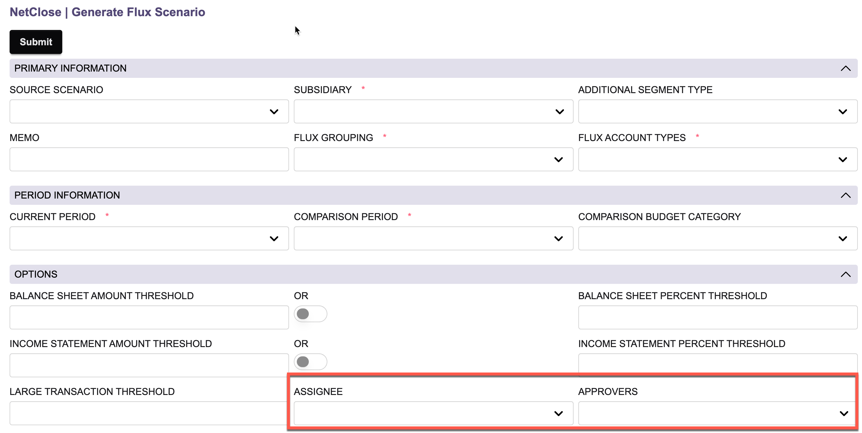 - If the Assignee and Approver(s) are populated on the Generate Flux Scenario Page, this will supersede any Account or Account and Subsidiary level mapping.