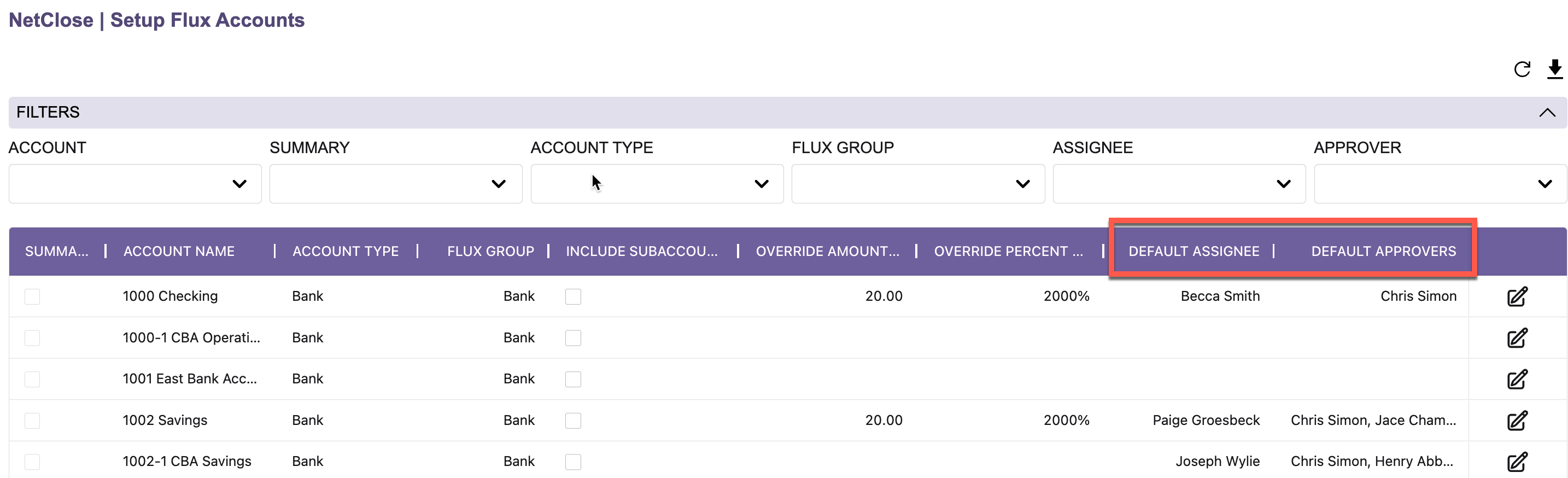 The Account-level Assignees and Approvers can be configured using a CSV import of the NetClose Flux Analysis Assignee and NetClose Flux Analysis Approvers fields of the Chart of Accounts record.