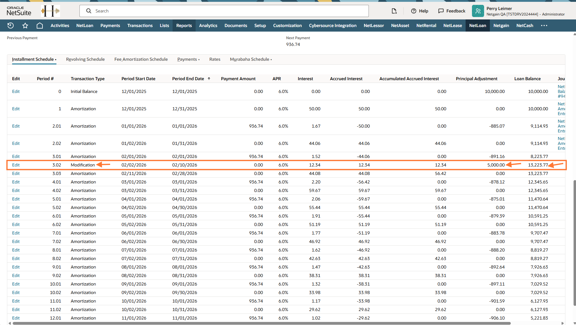 - Note that the schedule has been regenerated with a schedule line showing the increased principal balance on the effective date.
