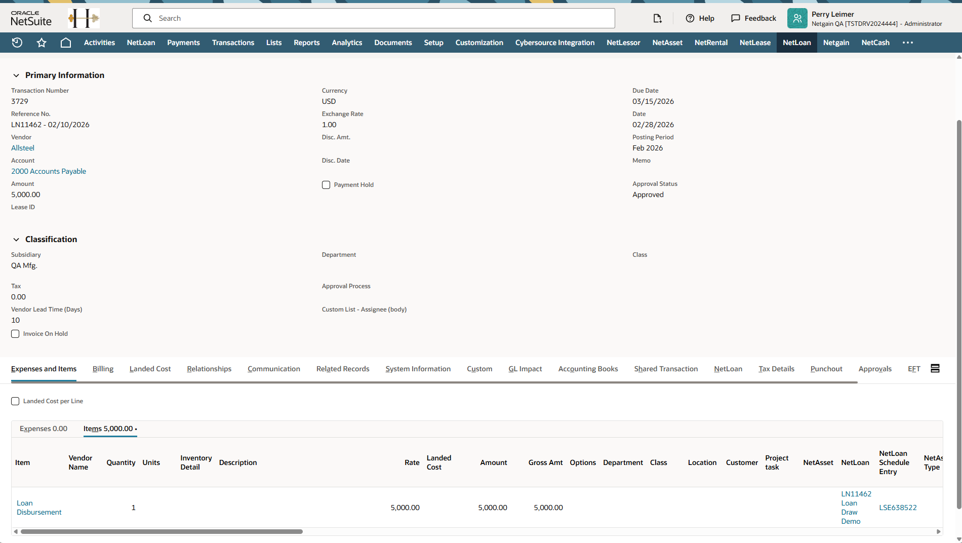 Beginning of Day Adjustment Amount Yes The amount of additional funds being advanced to the borrower. This will be added to the current principal balance. $50,000.00 Disbursement Vendor No The disbursement vendor is the vendor record in NetSuite to which the resulting bill will be made out to and against which vendor payment can be applied/entered.