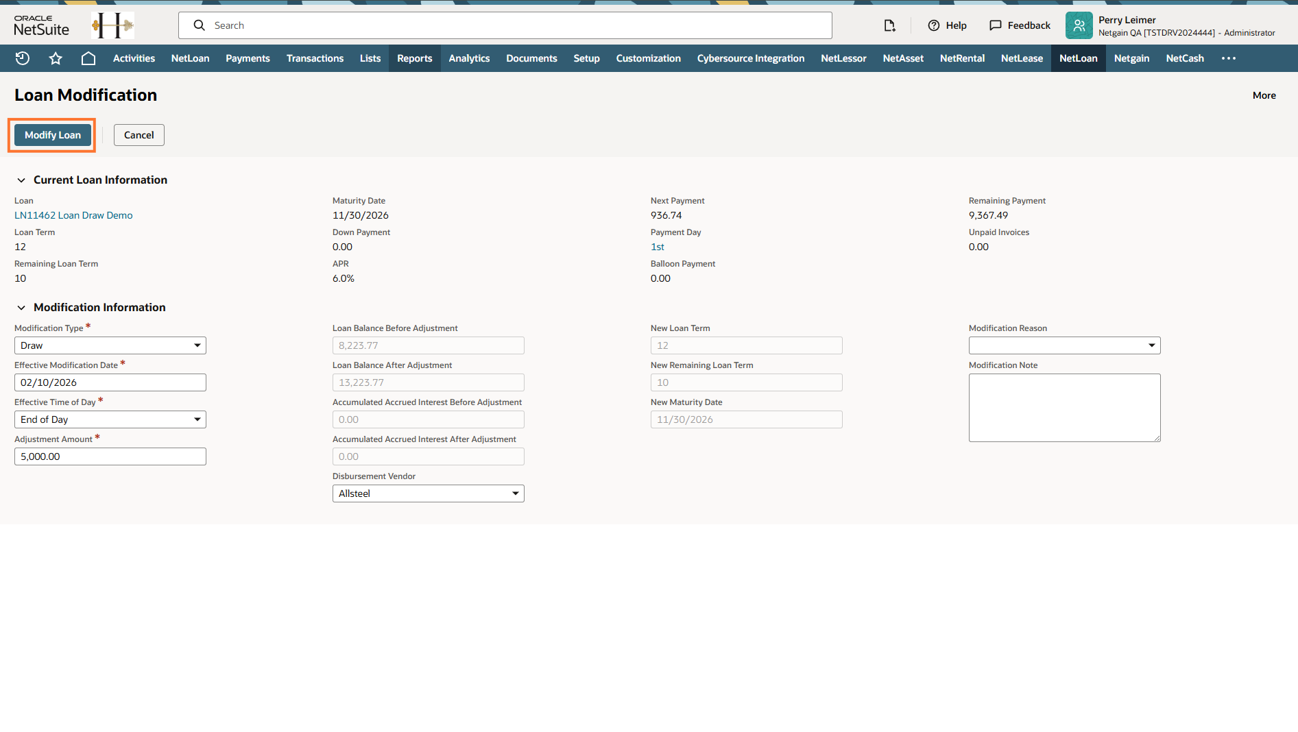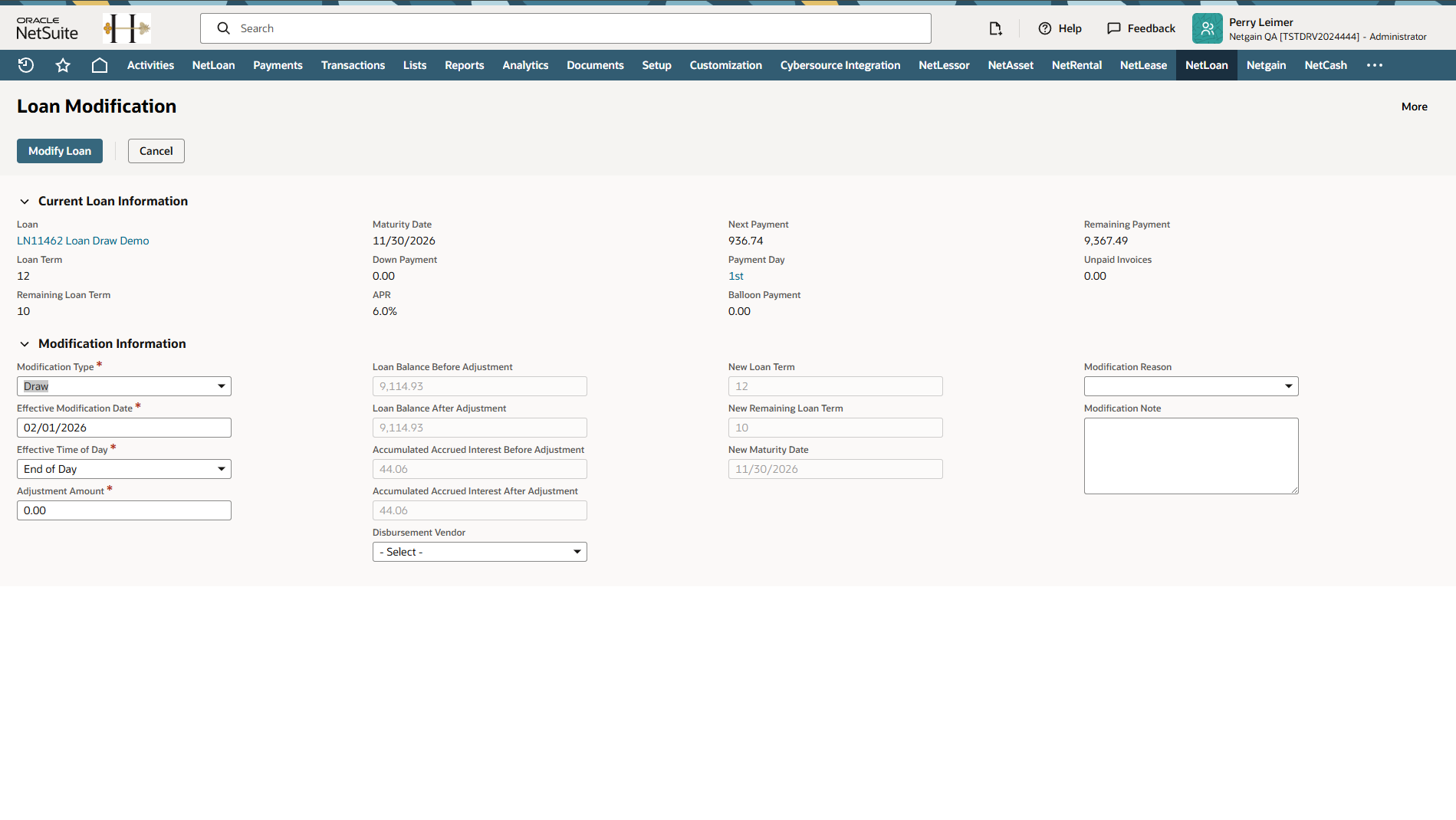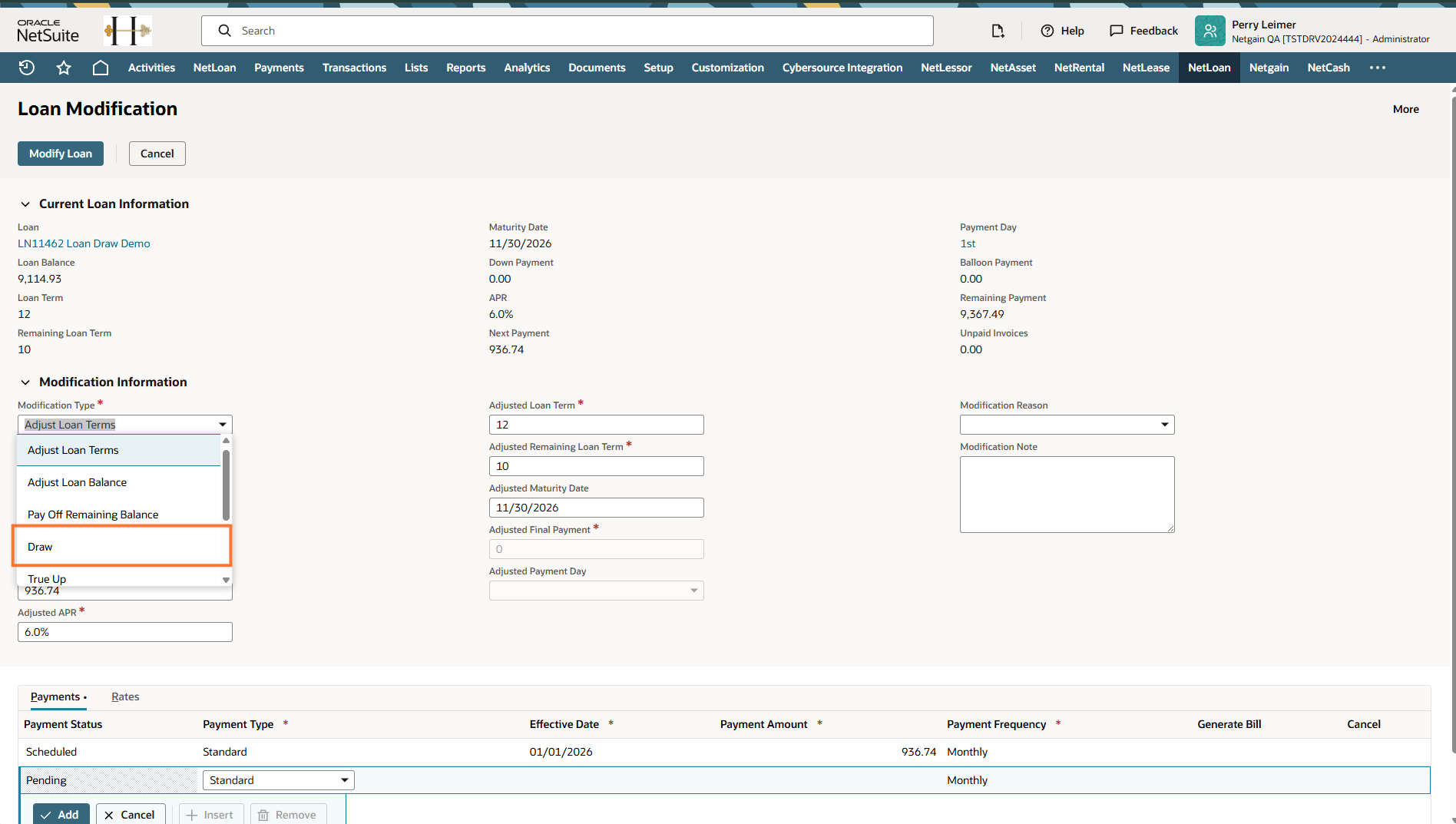 - The Draw modification type is available in NetLoan 2025.1 and later versions.