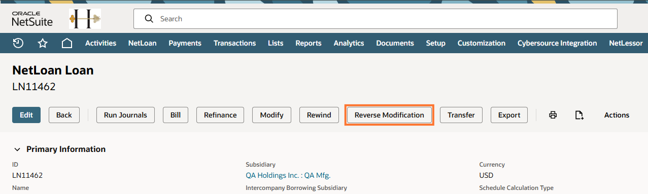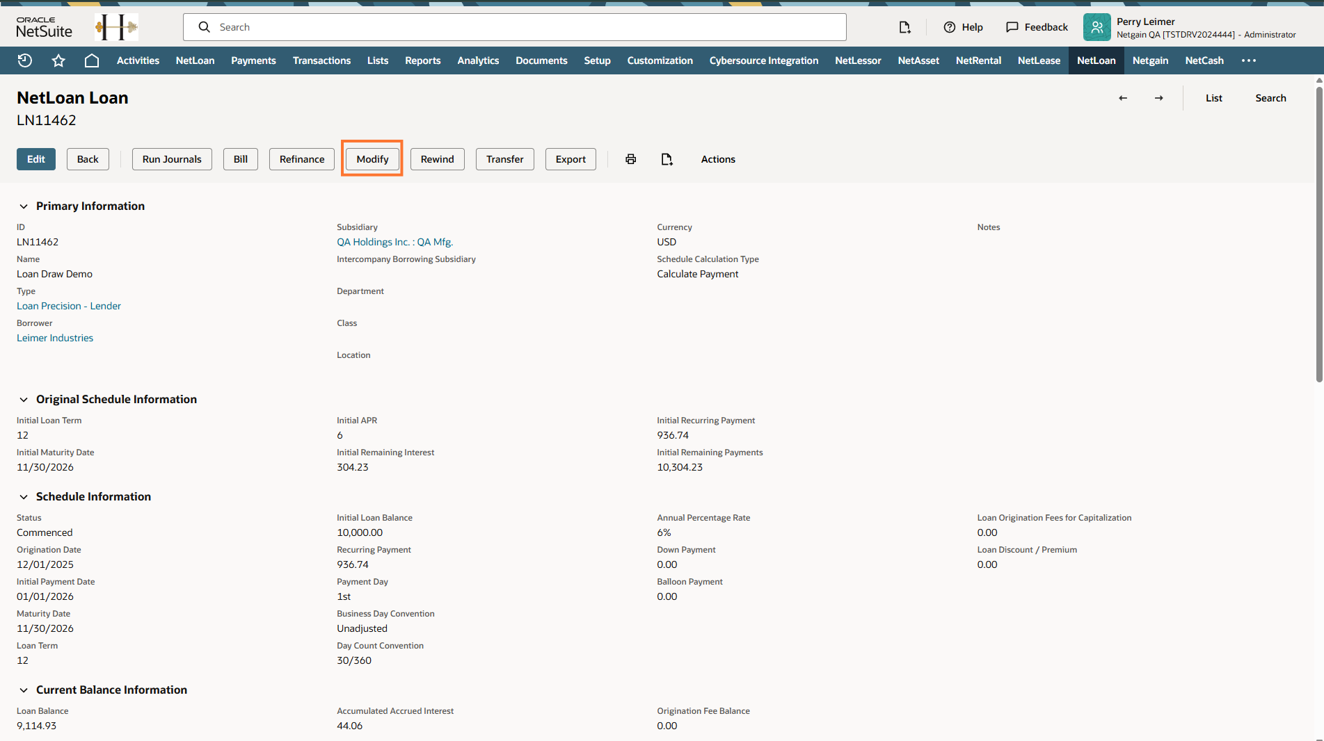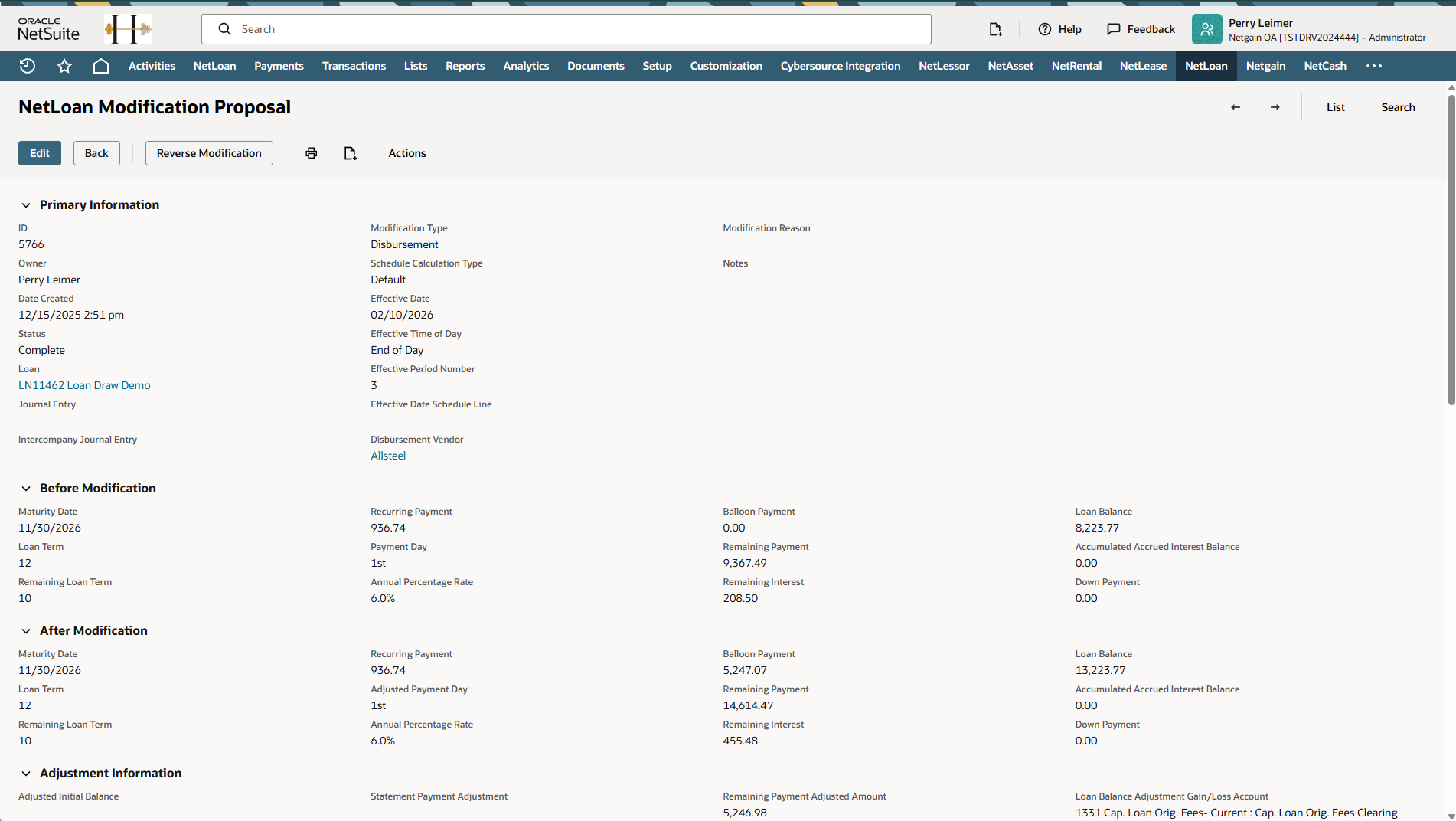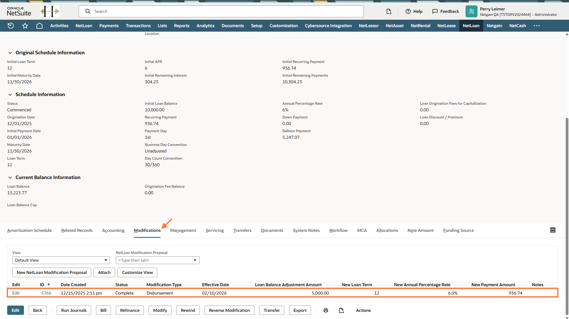 - A NetLoan Modification record will be saved on the Modifications subtab of the loan to save historical data before and after the modification