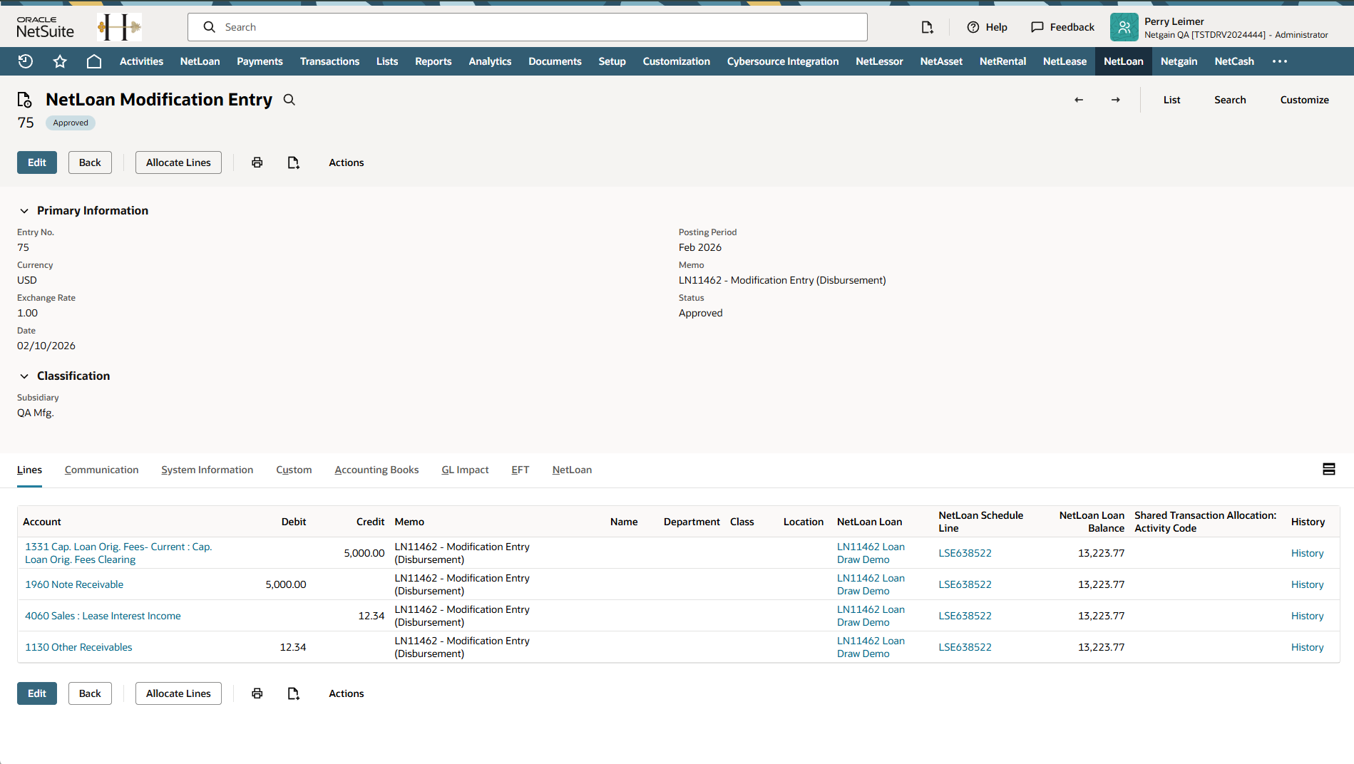 - When monthly amortization is processed, the system will create a NetLoan Modification Entry to record the draw to the general ledger:
