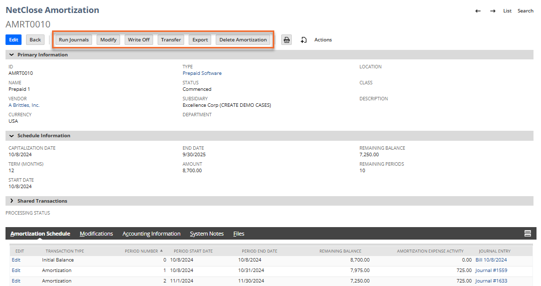 On top of having all your amortization schedules in one place, you also will have the functionality to run your monthly journals, as well as create new amortizations from transactions you have created within NetSuite. If you need to make any adjustments to your amortization throughout its term, the amortization module allows you to easily modify the amortization. Once all amortizations have been created, or when any entries have been run, an approver can go in and approve any transactions created by the amortization module.