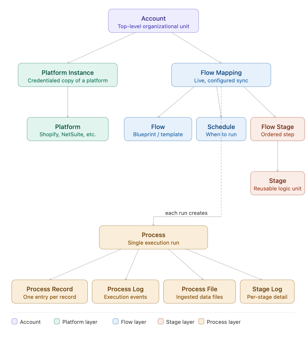 Example: "Acme Corp's Shopify Orders → NetSuite" is a Flow Mapping. It connects Acme's Shopify Platform Instance to Acme's NetSuite Platform Instance, and runs nightly via a Schedule.