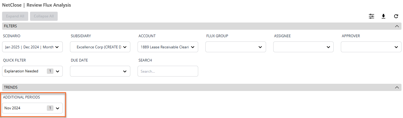 The Additional Periods dropdown in the Trends section lets you display extra periods alongside the current and comparison periods for additional context — useful when, for example, you want to view monthly or quarterly periods alongside an annual flux analysis. You can add as many additional periods as needed. When displayed, the current and comparison period columns will appear with a darker background to distinguish them from any additional periods.