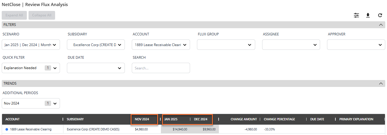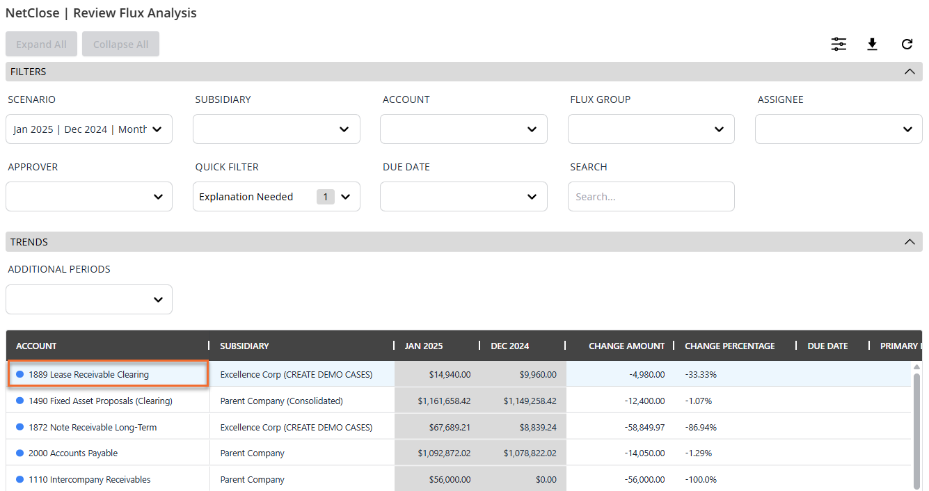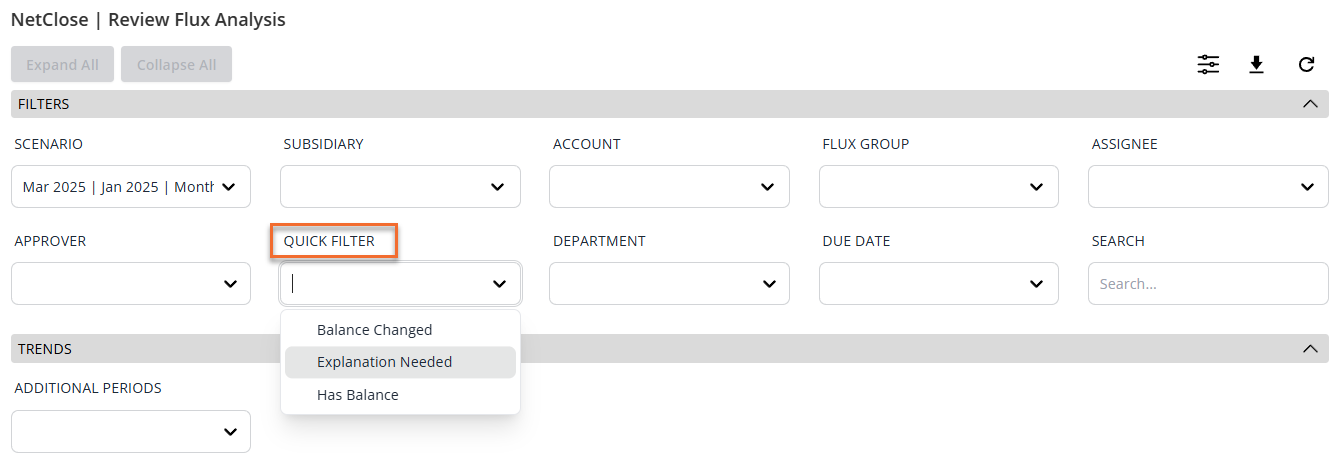 - Use the available filters to narrow down to specific accounts. One filter worth highlighting is the Quick Filter — selecting Explanation Needed will limit results to only those accounts that require an explanation because they exceed one of the predefined thresholds.