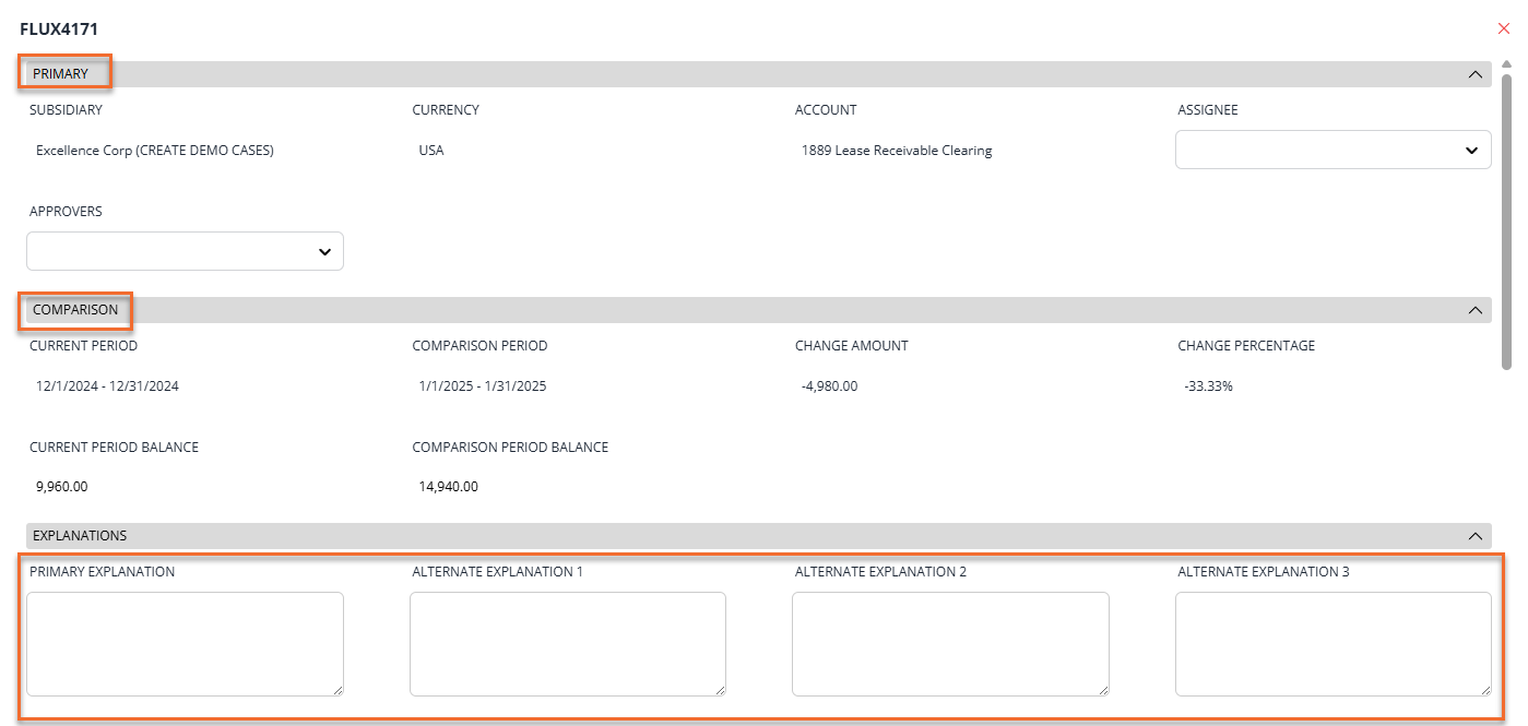 - Click on any account to open its Flux Analysis pop-up record. This record includes the primary account details, comparison data, and explanations for that account.