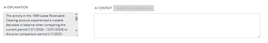 - If Flux Analysis AI is enabled, an AI-generated explanation will also appear in the Explanations section, along with an AI Context field where you can add supplemental context.