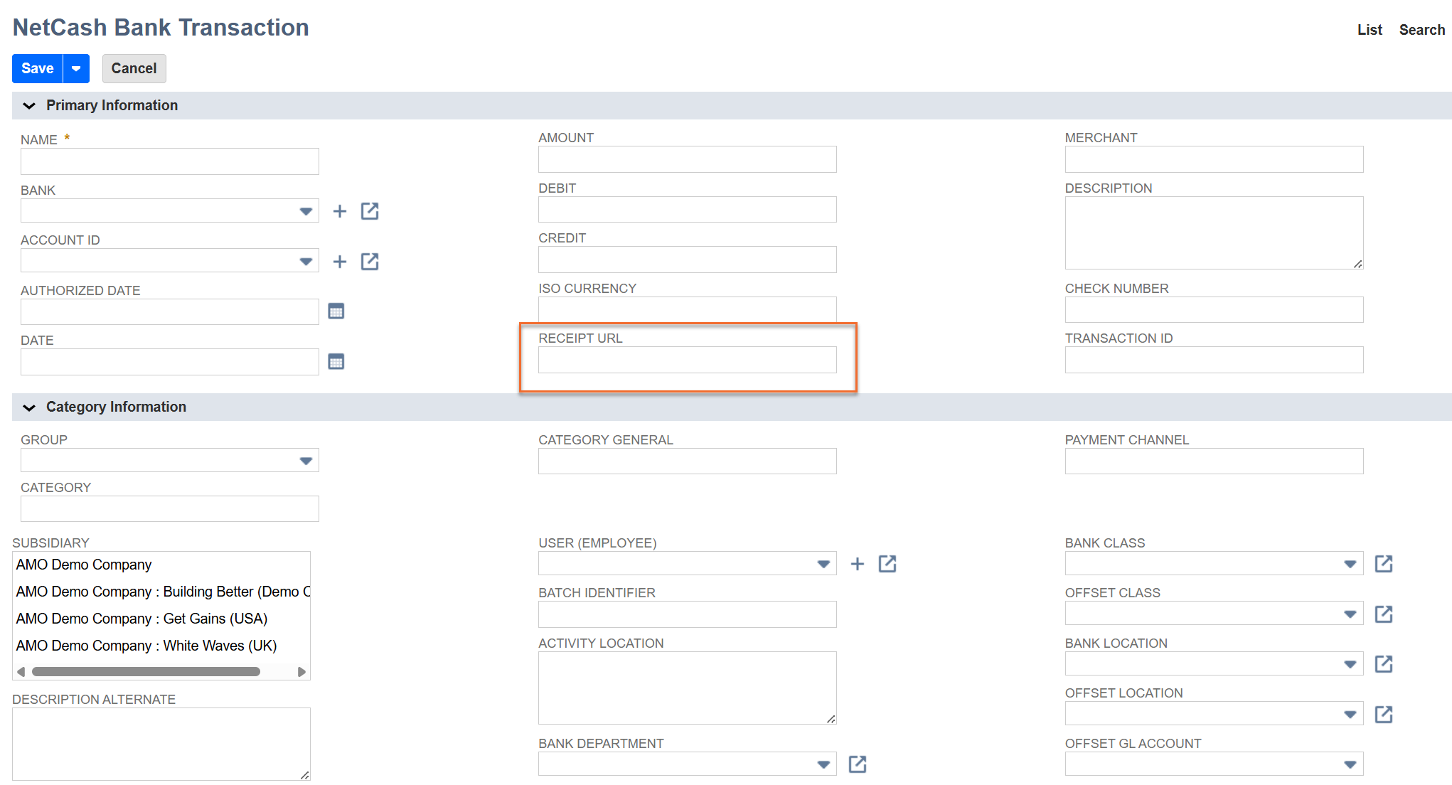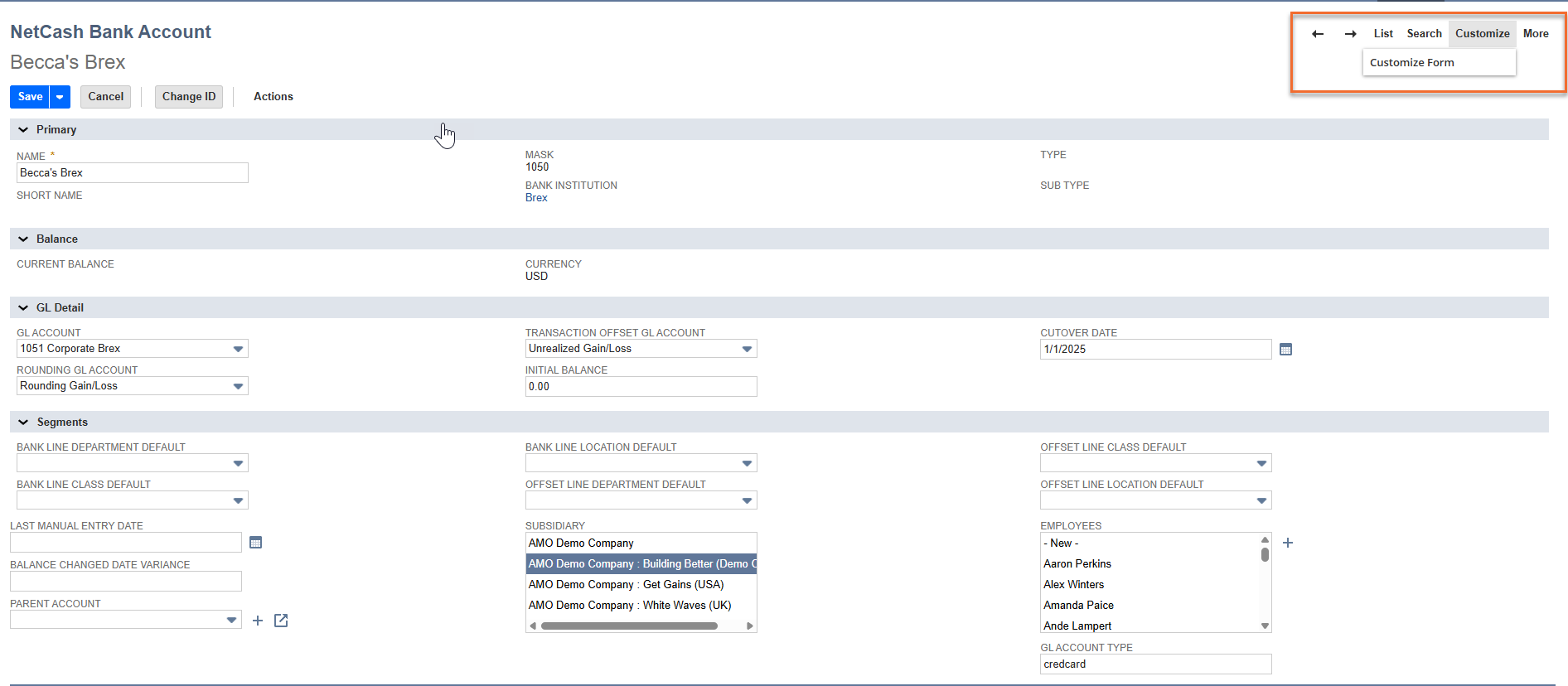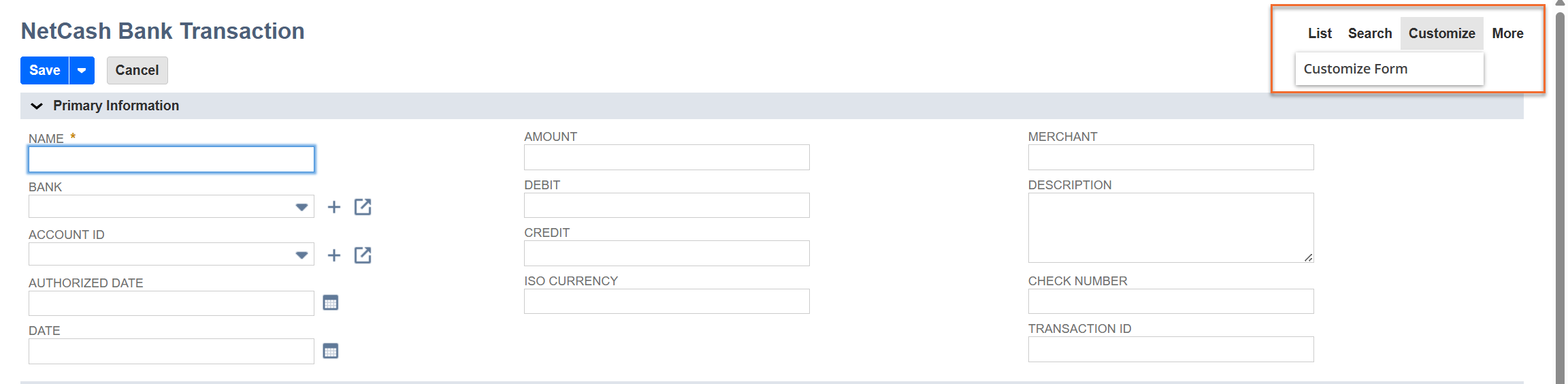 You can add any additional necessary fields or custom segments that relate to the credit card accounts by navigating to the NetCash Bank Account record view. To get to this view search NetCash Bank Account then click edit on one of the NetCash Bank Account records. By adding these fields on the Bank Account record, you will be able to automatically source specific data from the NetCash Bank Account when the corresponding GL transactions are created in NetSuite.