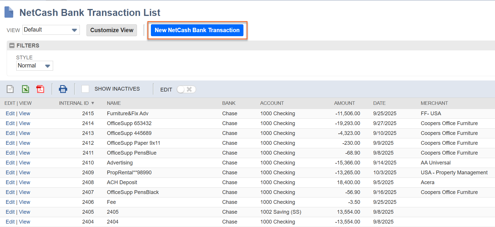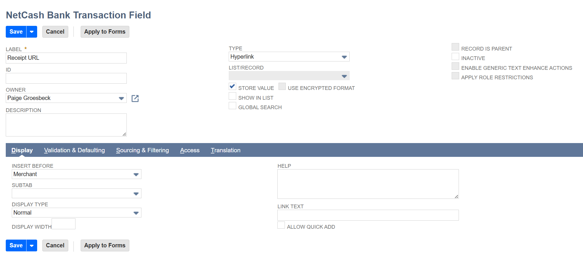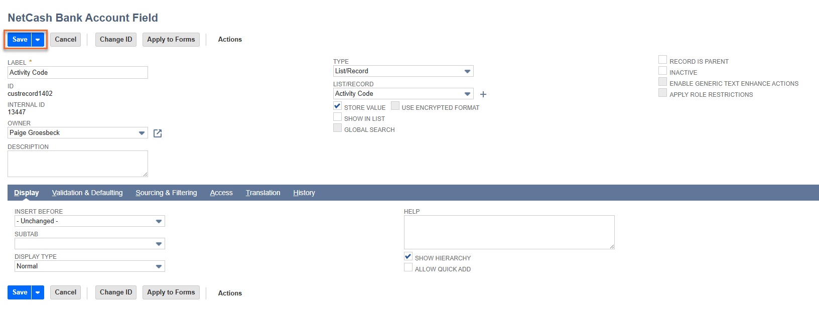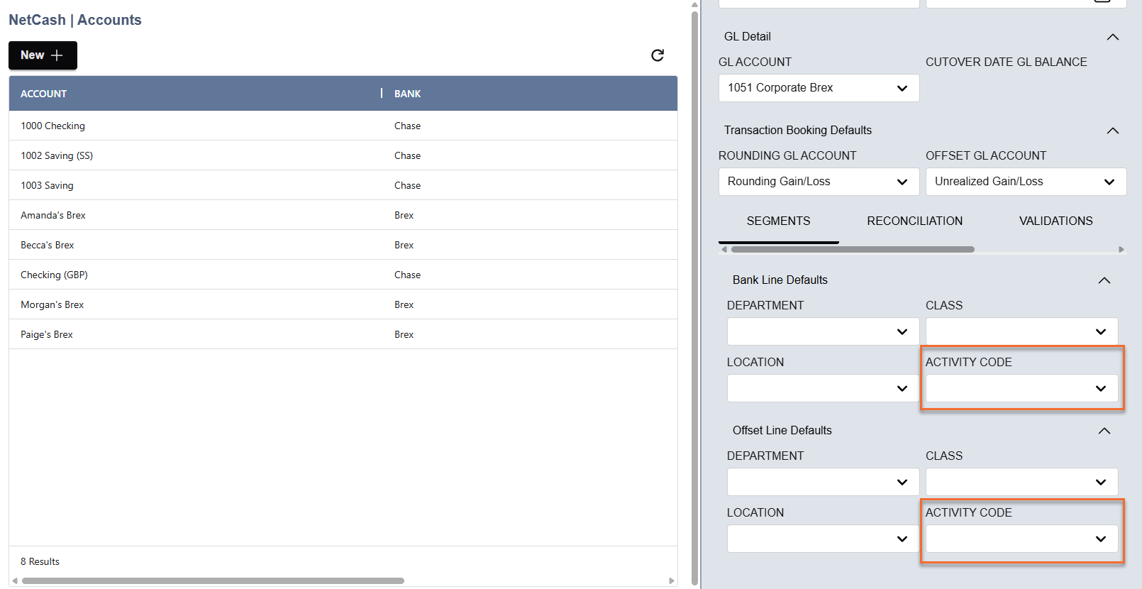 You can add any additional necessary fields or custom segments that relate to the credit card accounts by navigating to the NetCash Bank Account record view. To get to this view search NetCash Bank Account then click edit on one of the NetCash Bank Account records. By adding these fields on the Bank Account record, you will be able to automatically source specific data from the NetCash Bank Account when the corresponding GL transactions are created in NetSuite.